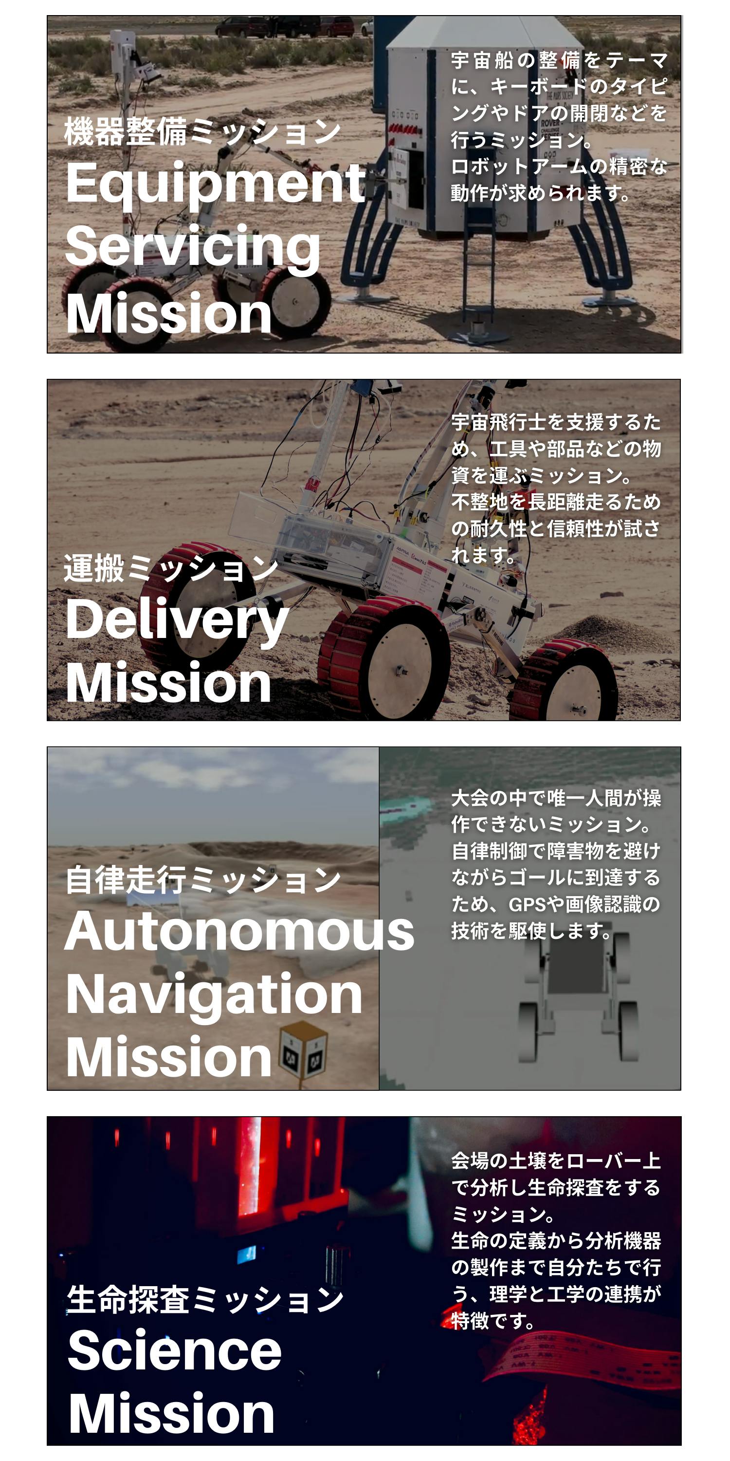 大会では、火星探査を想定した4つのミッションが課され、実際の火星ローバー運用に必要な技術力が試されます。高い走破性を持つローバーや、安定した通信システム、高性能なロボットアームや生命の有無を調べる科学機器すべてを、自分たちで設計・製作・運用して挑みます。