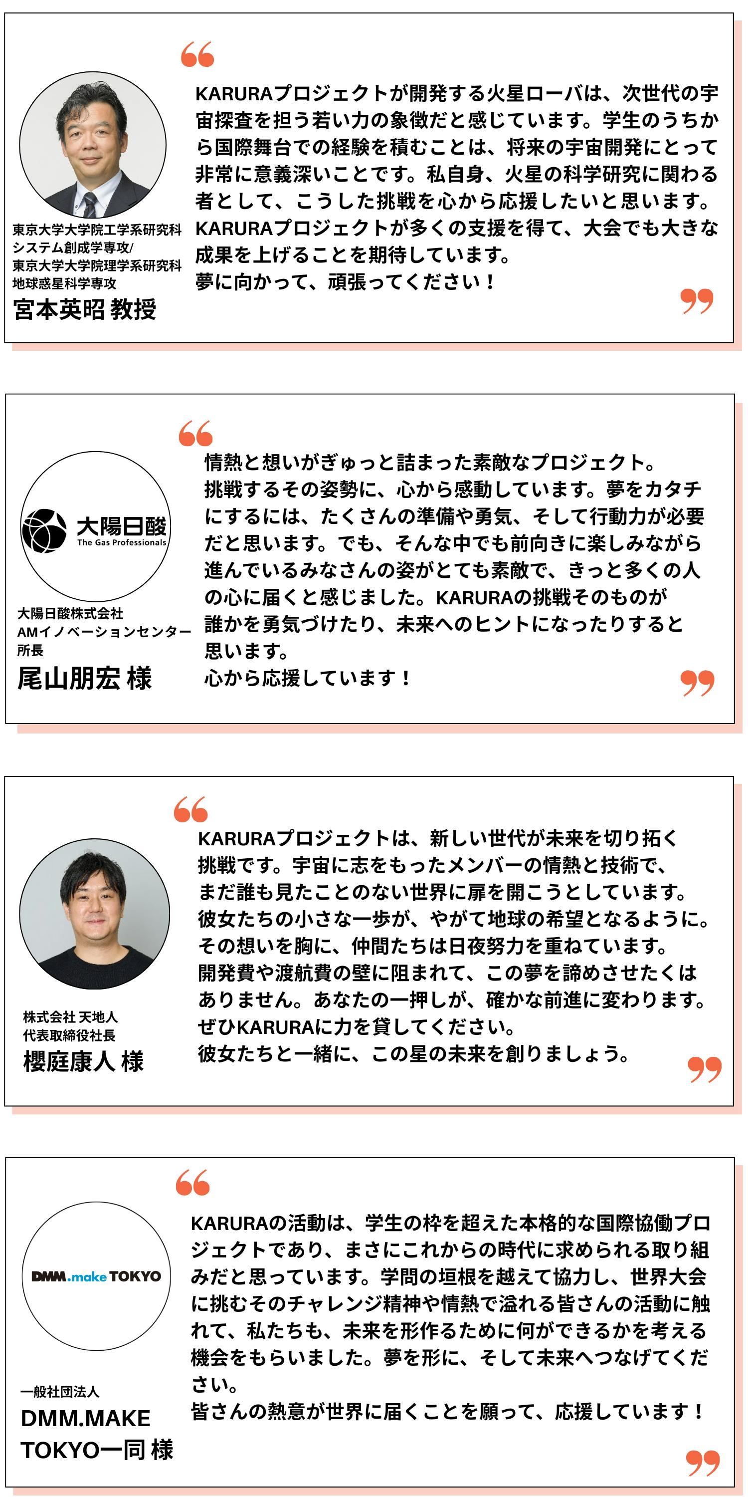 2025/06/09 13:59KARURA を応援してくださっている皆様KARURAプロジェクト クラウドファンディングを応援いただき、ありがとうございます。遂にクラウドファンディング最終日となりました!現在68名の支援者様から合計833,111円のご支援をいただいております。皆様からの応援とご支援に心より感謝申し上げます!今回の活動報告では、大会の3日目に行われた「Science Mission」についての概要説明と私たちKARURAの結果を報告いたします。Science Missionサイエンスミッション(生命探査ミッション)では、ローバーに搭載されたカメラ屋実験機器を用いてサンプルリターン地点を決定・サンプルを採取し、その科学的妥当性を考察します。また、ローバーでの探査終了後、審査員へのプレゼンテーション及びディスカッションを行います。私たちは今回、カメラによる地質探査、Micro Imaging Device (MID) による顕微観察、蛍光反応検出器を用いた有機物検出を武器に大会に臨みました。↑蛍光反応の様子どんな有機物が検出できるかもわからない環境で探査を行うため、検出可能性とスピードを重視した検出方法を採用し、実験や考察、練習を重ねることで効率的な検出・進行を目指しました。↑蛍光反応検出器で上の蛍光反応の様子を撮影した様子(右) 蛍光強度を定量化した様子(左)直前までローバーでの操作・プレゼンテーションの練習を重ね、秒単位の綿密な計画を立てて臨んだミッション本番では、当初は順調に進んでいたものの、ローバー内実験用のドリルに異常が発生、蛍光反応検出器・MIDを用いた実験・観察ができない状況に陥りました。すぐさまカメラでの地質探査に注力しましたが、その後ローバーとの通院が断絶、その時点で得ている状況でのプレゼンテーションを行うこととなりました。↑ローバーを操作するコントロールステーション内部の様子その時点で得ていた地質・高度データと事前情報に基づいたプレゼンテーションとディスカッションにより、最終的には73点(100点満点)を獲得しました。↑サイエンスモードのローバーの様子今年は蛍光反応検出器や、MID・地質観察でのデータ自動・半自動解析など、新しい試みを様々導入していたものの、それらを動かす段階まで至らなかっただけに、悔しい結果となりました。来年大会に向け、今年搭載していた実験機器の検証や改良、新しい検出法の模索を進め、更なる高得点の獲得を目指していきます。クラウドファンディング終了まで残りわずかとなりましたが、今後とも温かいご支援を賜りますよう、お願い申し上げます。 もっと見る