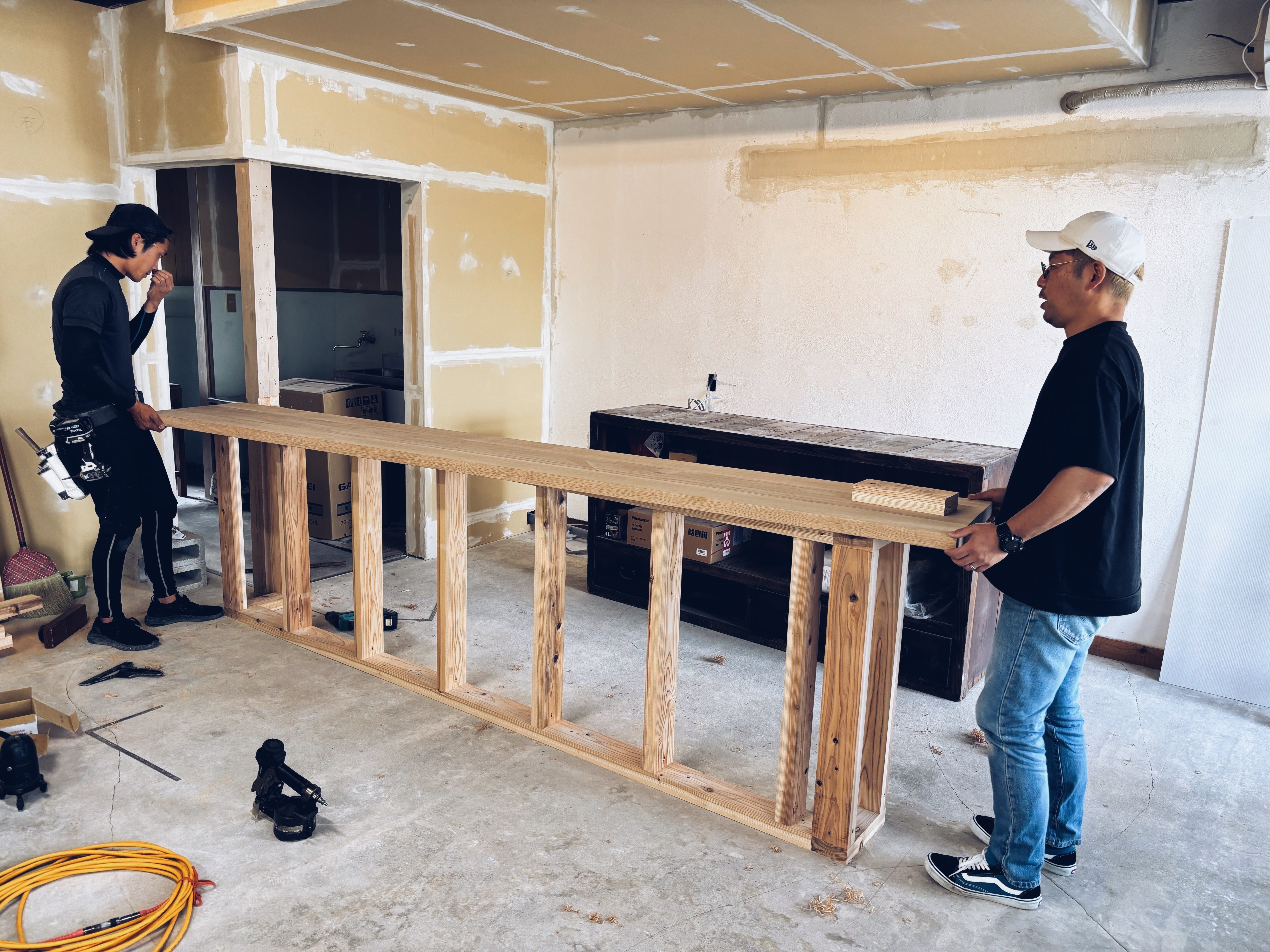 現在都農町の仲間と内装工事を進行中。この町はなんでも作れる「百姓」のような人が多く、日々助けられています。