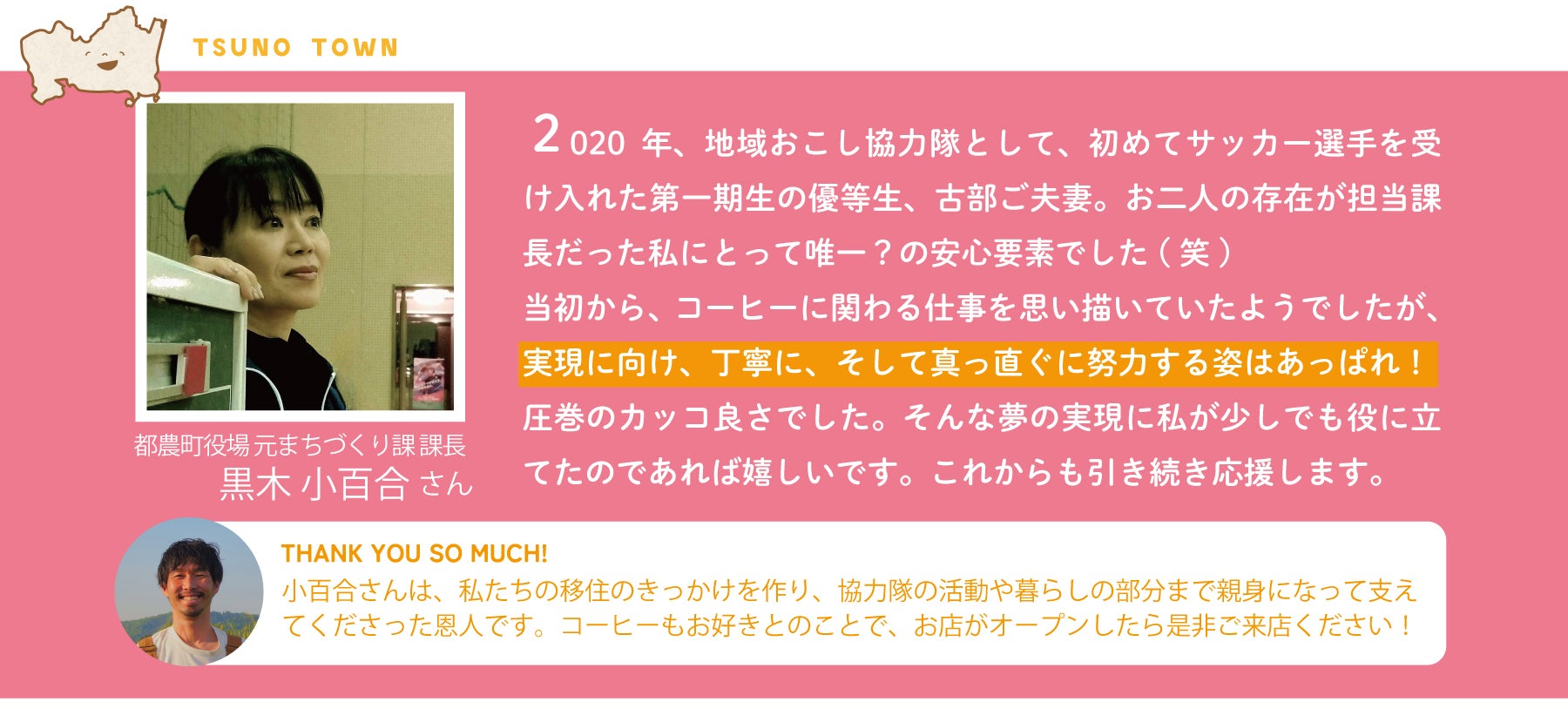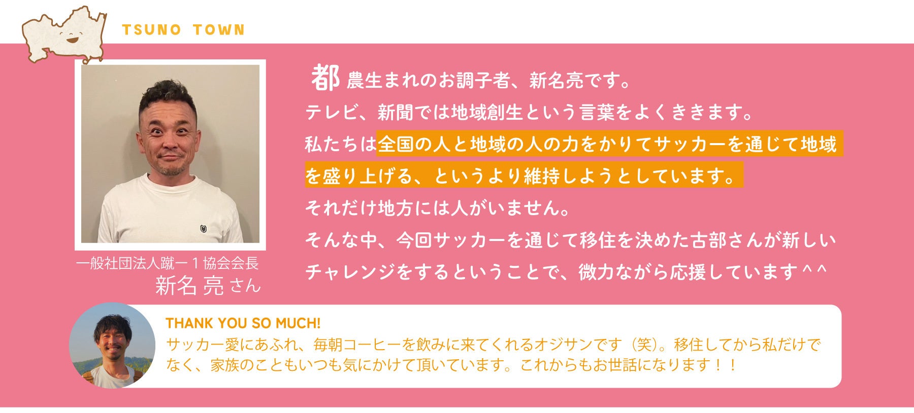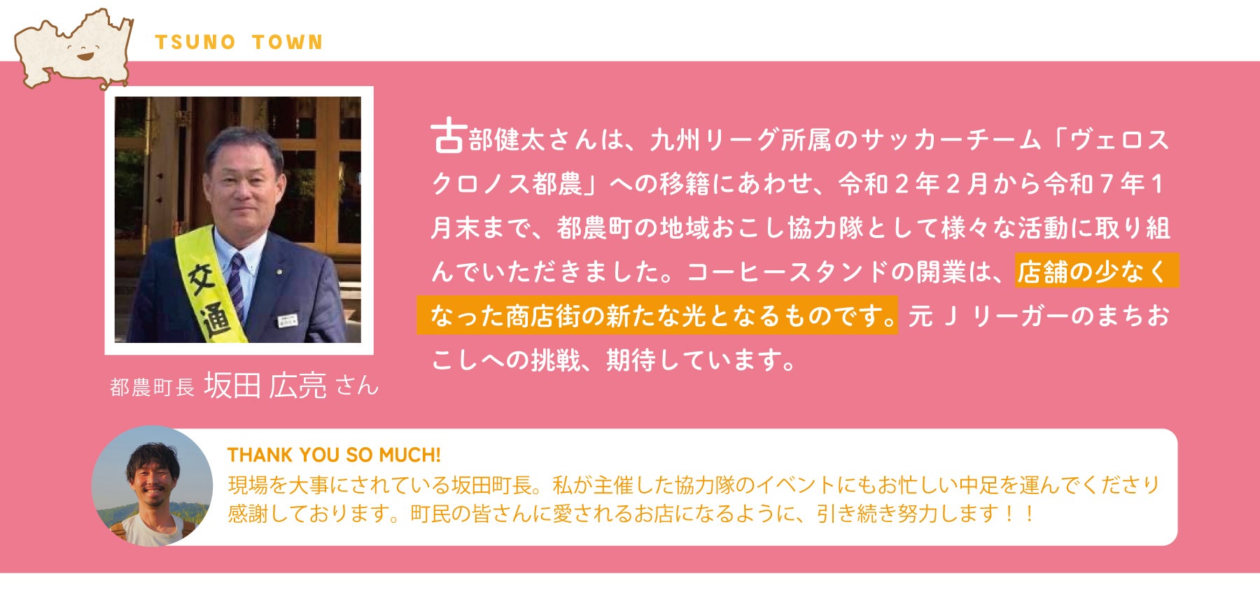 都農町という、サッカーがつないでくれたこの土地で、サッカーとは違う新たな「つながり」を作っていけたらと思っています。ぜひ、新しいお店でお会いしましょう。遠方の方ともオンラインでつながれたら嬉しいです。