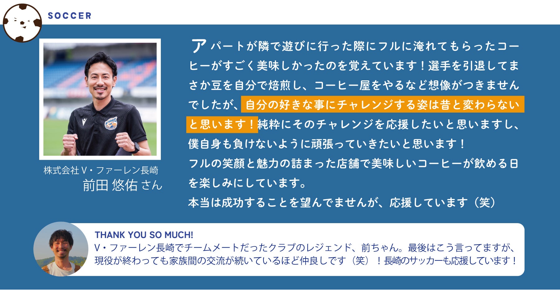 現役時代、サポーターの皆さんからの応援は、どんなときも本当に力になっていました。引退した今も、新たな道を歩む私の挑戦を応援していただけたら、こんなに心強いことはありません。