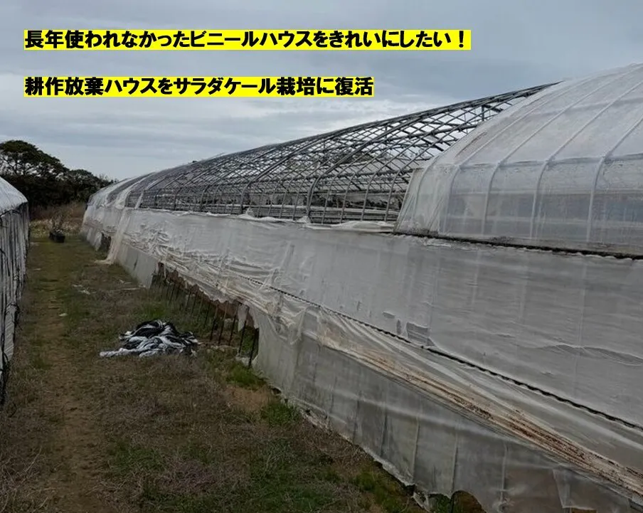 耕作放棄地となった大型ビニールハウスを修繕、復活させて、”サラダケール”の栽培を規模拡大を計画し、ハウス内の除草作業や周りの整備などを行っていく。10月以降栽培されるサラダケール収穫作業を社会福祉事業者にお願いしていきます。また、引きこもり支援事業者のハウスに作業支援、協力をして少しずつ面積を増やしていきます。