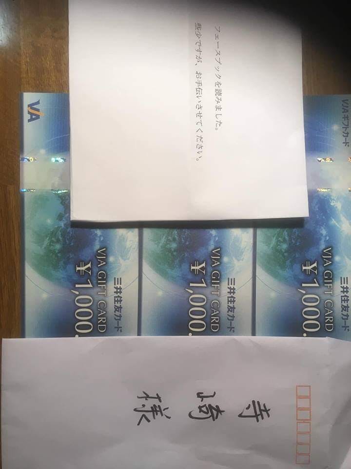 支援しているT氏のご自宅ポストにFBを見をという方から商品券が………差出人のお名前がなかったそうです。 T氏がFBに写真つきでアップしていますので、こちらでもシェアさせていただきます。