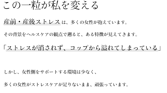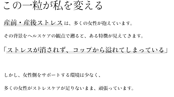 だからこそ、整塩に頑張る女性たちを体内からサポートし、さらに輝かせる架け橋となる存在(サプリ)になって欲しい。