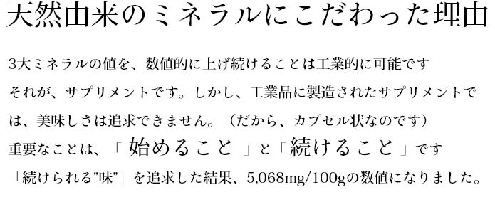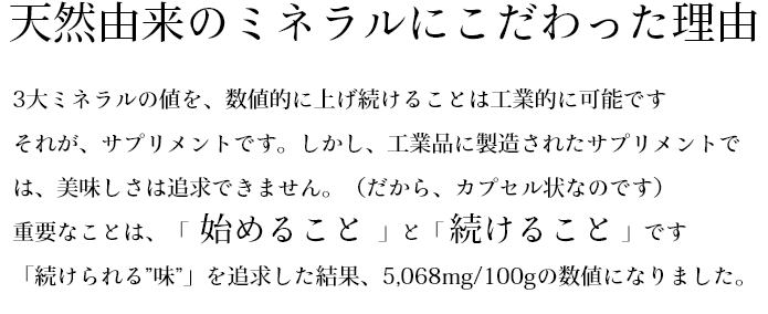 他にはない、整塩特有のうま味とミネラル含有率は、3年の試行錯誤を経て成し遂げた品質です。