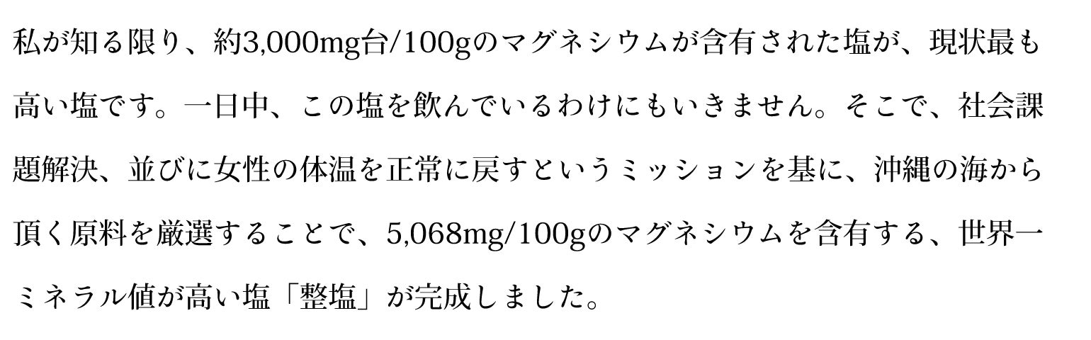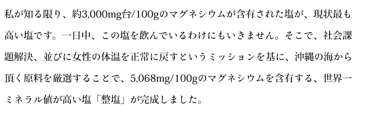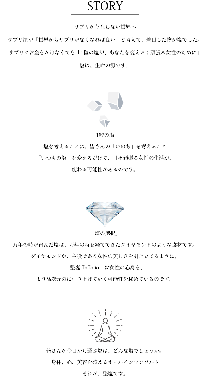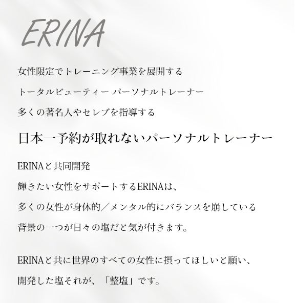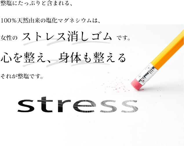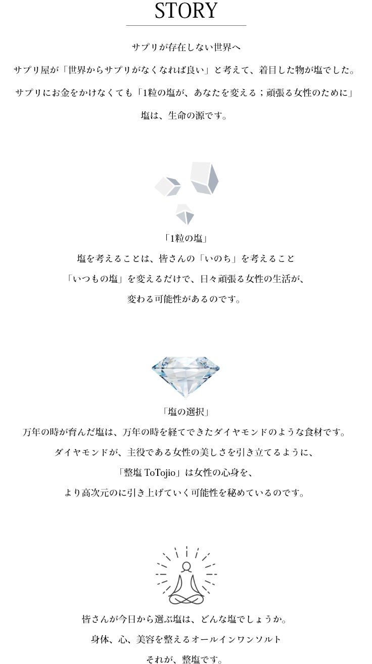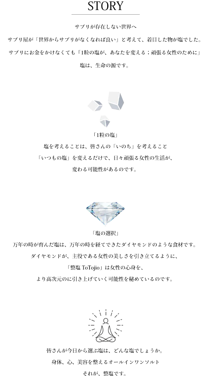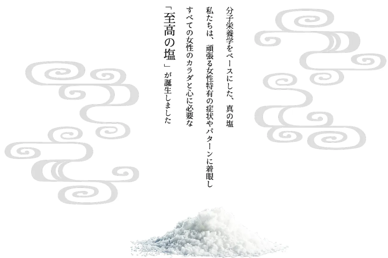 世界一のミネラル含有率を誇る「整塩」は、女性の心身バランス、大事なライフステージを「整えていく塩」。