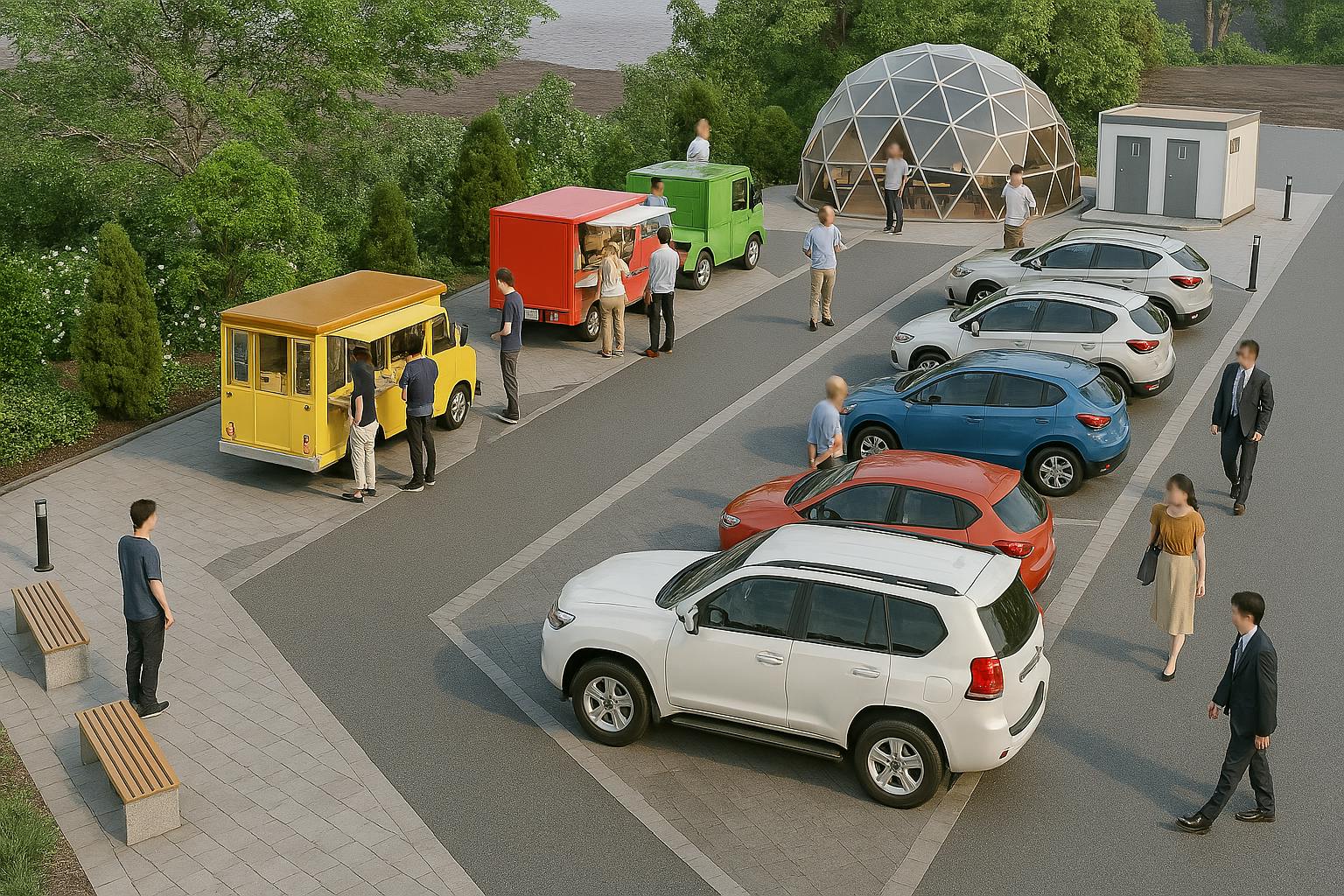 駐車場の整備、設備の配置もほぼ決まり、小さなキッチンカーたちが並ぶ場所としての輪郭が、ようやくはっきりと現れはじめています。