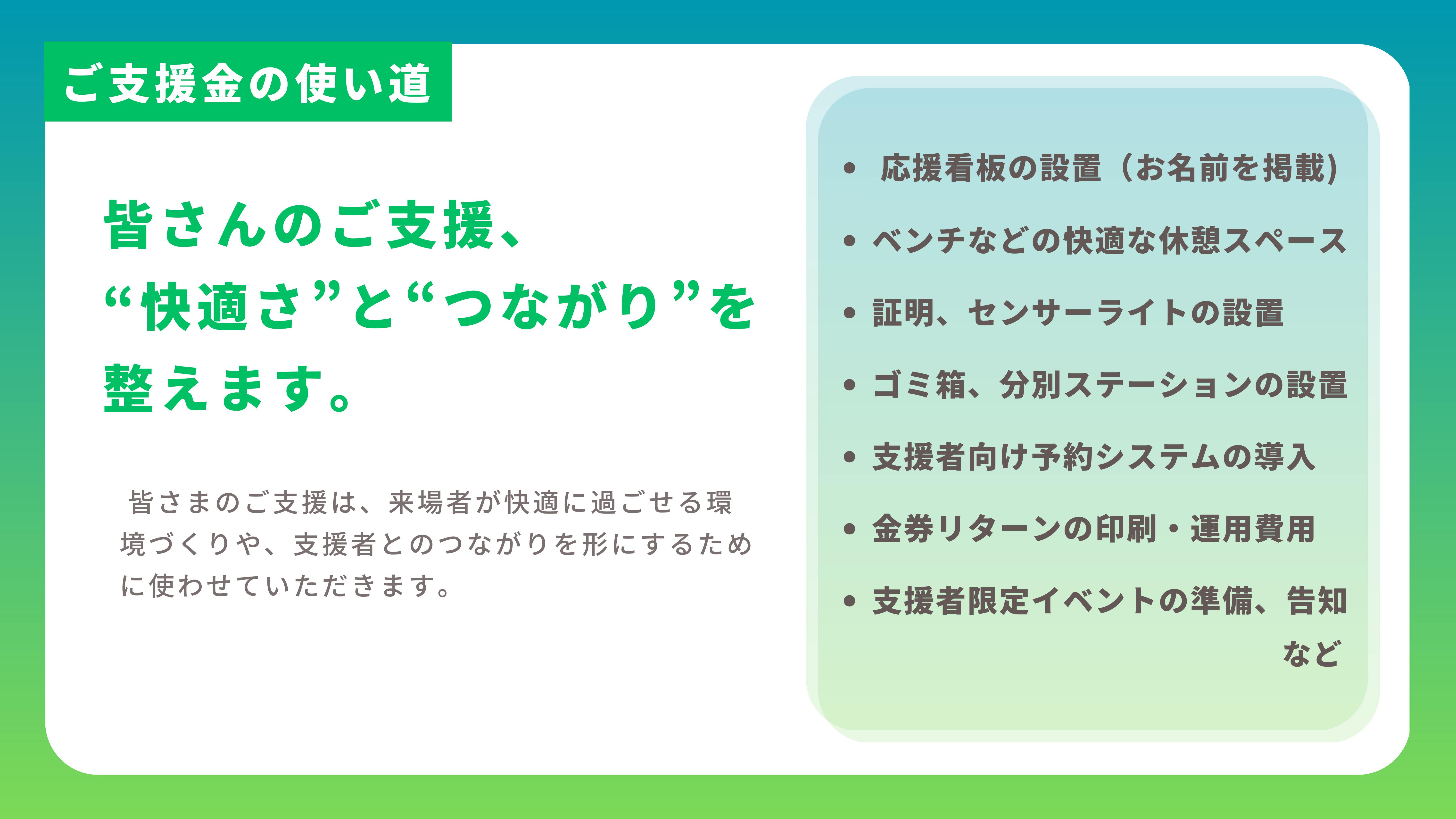 このタイミングで支援してくださる皆さんと、空間の“最後の仕上げ”を一緒に形にしていきたいと思っています。