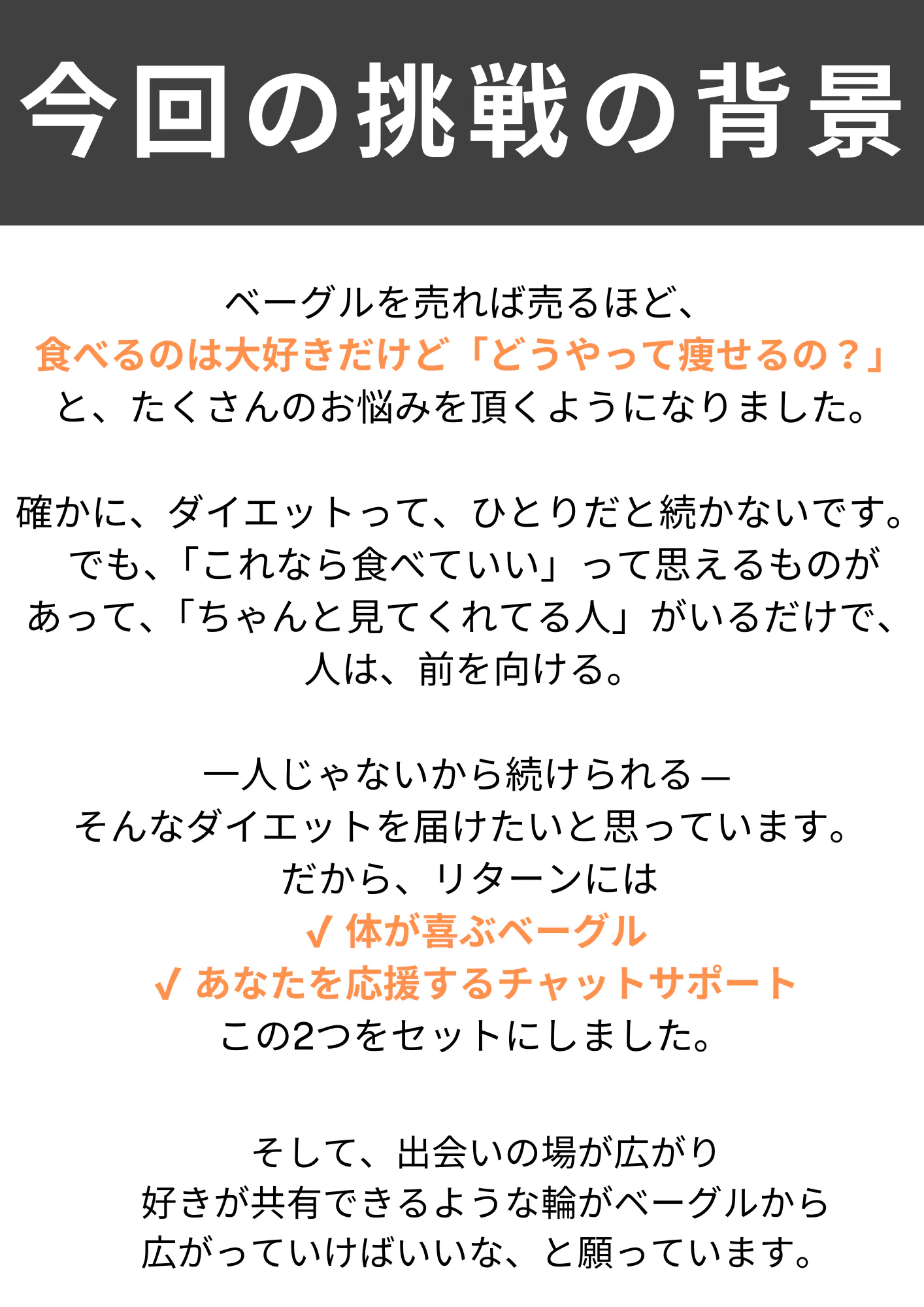 いただいた支援は、キッチンカー購入に関わる費用(車両代、諸経費)や設備等に使用させて頂きます。まだまだフォロワー数も少なく認知度も低い駆け出し者ですが、美味しいベーグルでダイエットやボディメイクで悩んでいる人を救いたい!という思いだけは負けません!