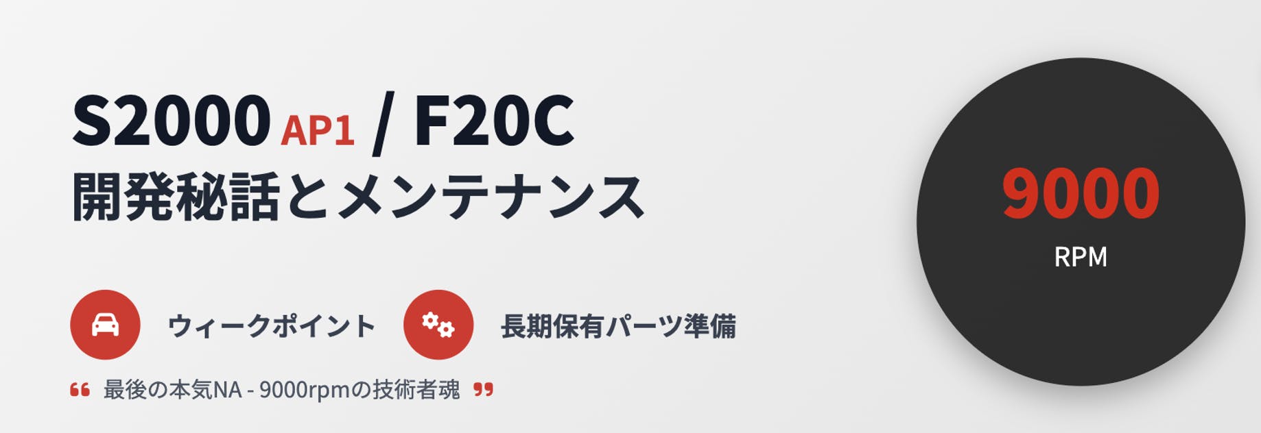S2000(特にAP1)やF20Cに関する秘話やウィークポイント、一生乗る上で準備した方が良いパーツなど、松本店長の知識をお借りしたいです。また、現在所有しているS2000のコンディションなどについてご相談したいです。