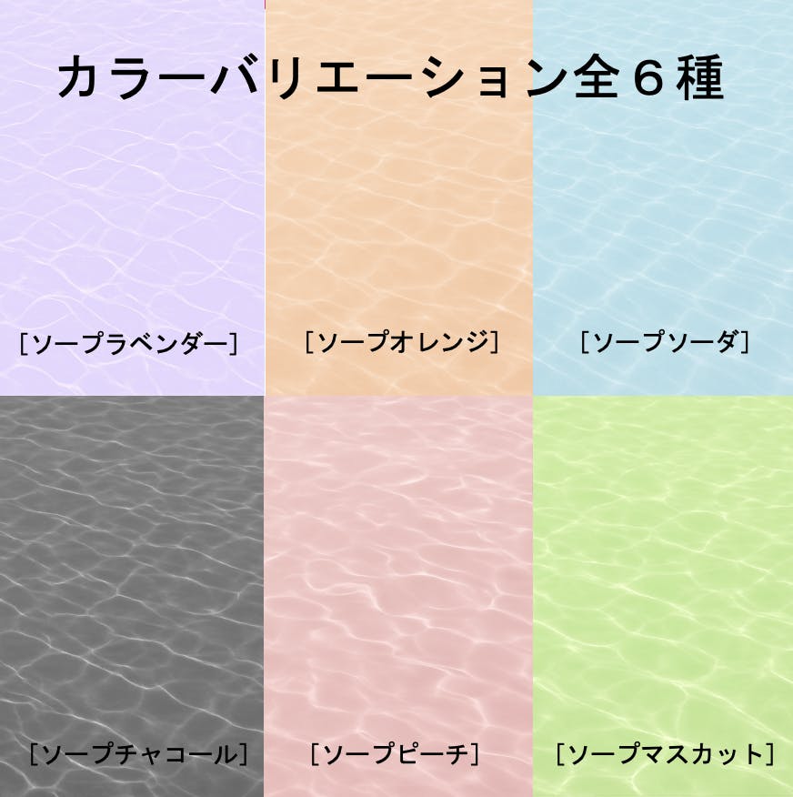 カラー:全6色 「ソープソーダ」 「ソープピーチ」「ソープチャコール(グレー)」