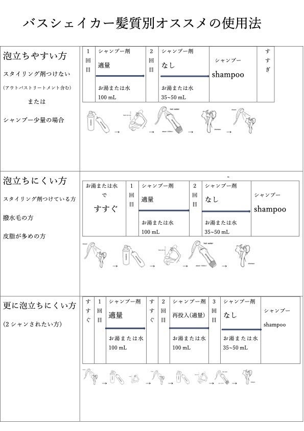 オススメの使用法としましてはシャンプー&水(お湯)を投入後、数〜十回以上、上下に振った後にしばらく天地逆さにし再度元に戻して数〜十回以上振っていただきますと容器内の水(お湯)とシャンプー剤がうまく混ざり合い、シャンプーに適した泡質と泡量が確保できます。