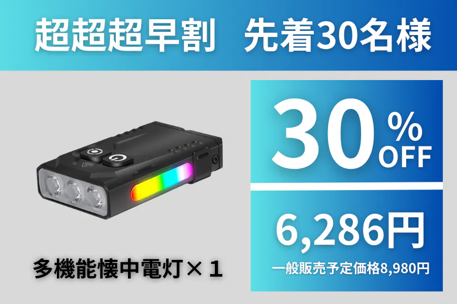 6. ライトの点灯モードはバッテリー残量により使用時間が変動します。特に高輝度モードでは消耗が早いため、使用後はこまめな充電をおすすめします。