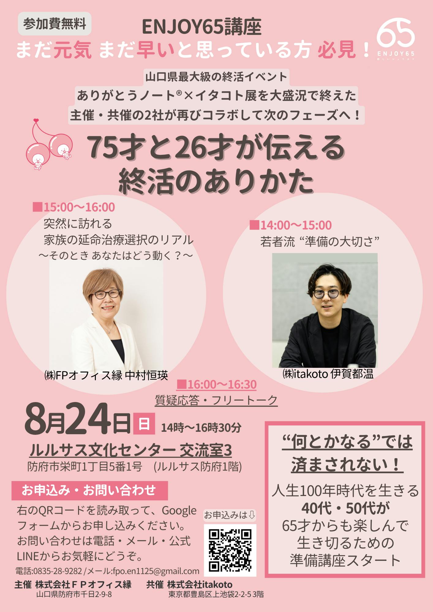 • 6月15日・16日で開催いたしました ありがとうノート®×イタコト展。山口県最大級の終活イベントから約ひと月半。続編として無料セミナーの開催が決定いたしました!!■75才と26才が伝える終活のありかた弊社の代表 中村恒瑛が、7月20日に遂に後期高齢者となる75才に・・・!株式会社itakotoの伊賀社長の年齢と合わせて100才と打ち出しておりましたが、めでたく101才となりました♪そんな75才と26才が再び集結!ここ、山口県防府市で無料セミナーを開催いたします!75才と26才、それは親子ですらなく祖母と孫世代。そんな世代の全然違うふたりから見たそれぞれの終活とは・・・?■若者流 “準備の大切さ”株式会社itakoto 伊賀都温社長のセミナーは『若者流 “準備の大切さ”』!Z世代と呼ばれる世代から見た終活の必要性とは?なぜ20代という若さで終活業界に足を踏み入れ、代表取締役社長にまでなったのか?フリートークや質疑応答など、当日様々な疑問を解消してくれる予定です!■突然に訪れる 家族の延命治療選択のリアル株式会社FPオフィス縁 中村恒瑛のセミナーは『突然に訪れる 家族の延命治療選択のリアル ~そのときあなたはどう動く?~』です。75年という人生の中で経験してきた義母・実母・義兄・夫の延命治療選択の場面。それら様々な場面でのリアルを交えてFPとして、娘として、妻として、母として・・・終活のありかたをお伝えします!■無料セミナーは8月24日開催!セミナーは1か月後の8月24日(日)14:00~16:30で開催!場所は山口県防府市のルルサス文化センター 交流室3(防府市栄町1丁目5番1号ルルサス防府1階)♪参加料は無料で定員20名、事前申込制となっています。お問い合わせは電話・メール・公式LINEでお気軽に♪お申し込みはこちらから➡https://docs.google.com/forms/d/e/1FAIpQLSdlQbJ_ZBvaHdfTqKZ0-e9bxBgQLxy3k0XLdSs2dND9QplEbg/viewform皆様のご来場、心よりお待ちしております。 もっと見る