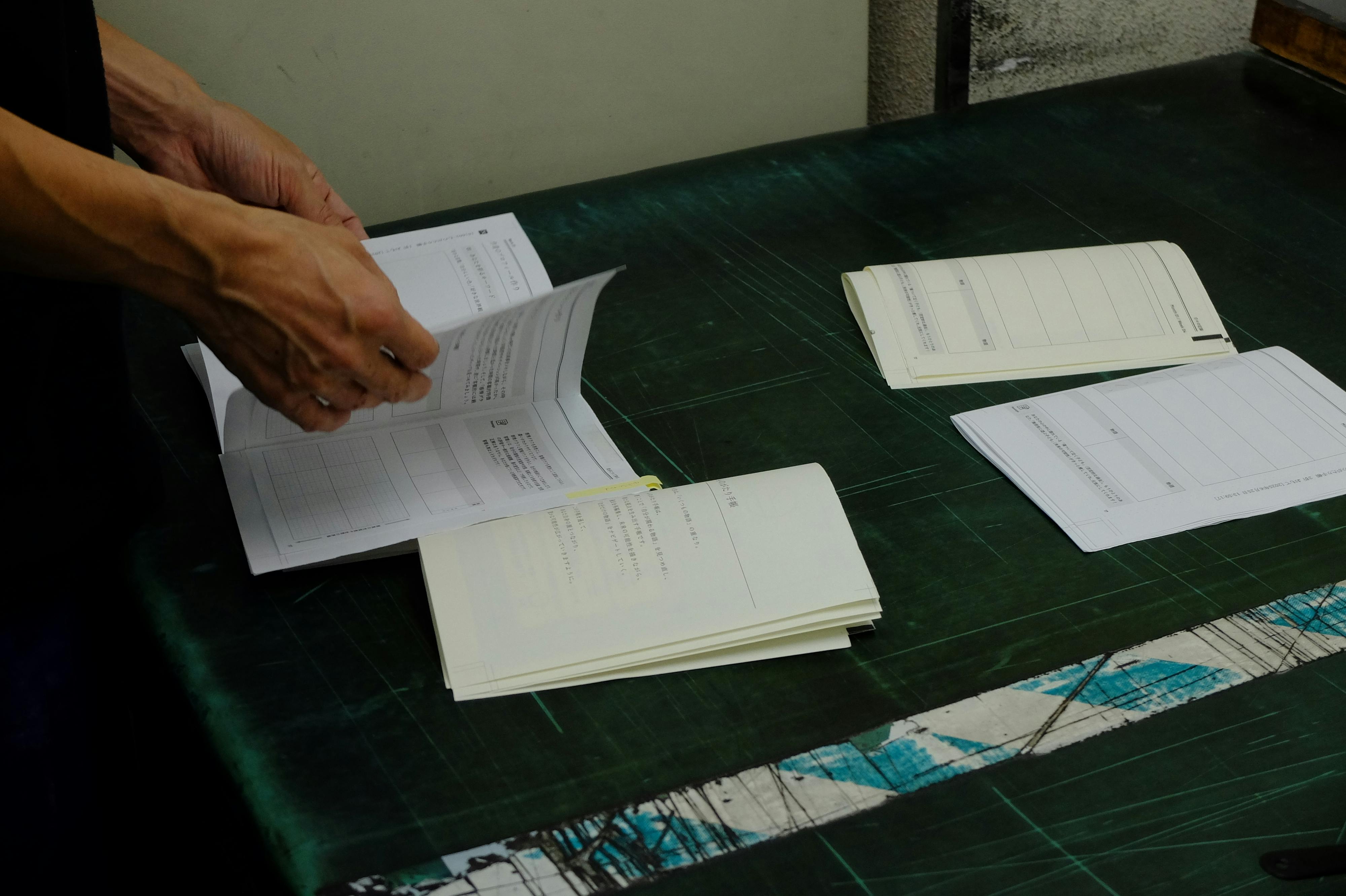 職人さんが一冊ずつ丁寧に内容を確認している場面。