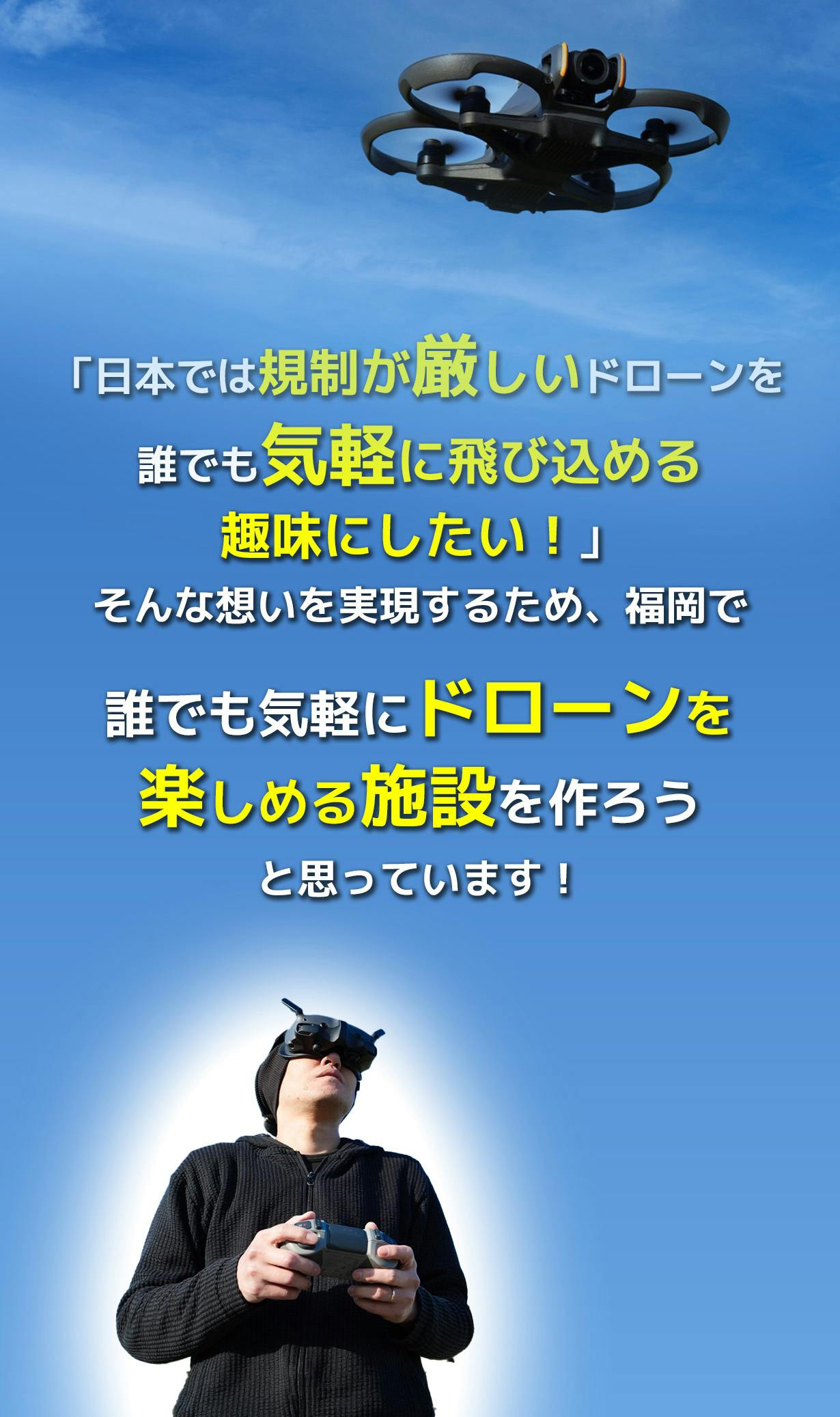 あなたの支援があれば福岡で誰もが自由にドローンを楽しめる場所が完成します。どうかご支援の程よろしくお願いします!