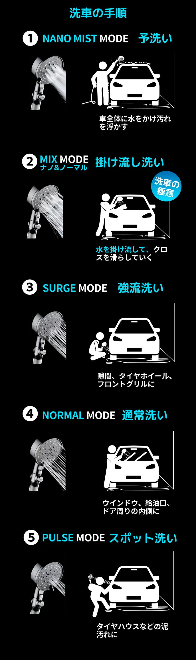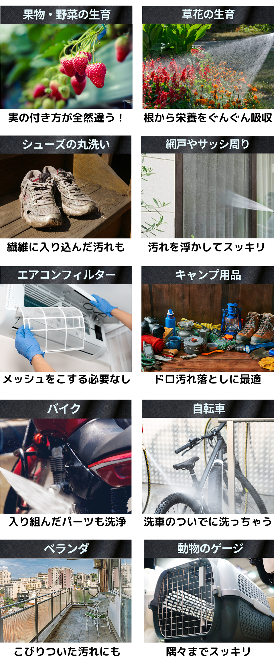 化学成分の洗浄液を使わず、空気と水だけの技術力のみ!塗装への悪影響も洗車キズの心配もありません!しかも、余計な水跳ねがないので、省スペースでご近所に気兼ねなく洗車ができます。初心者の方から洗車マニアの方まで、ご満足いただける仕様に仕上がりました。