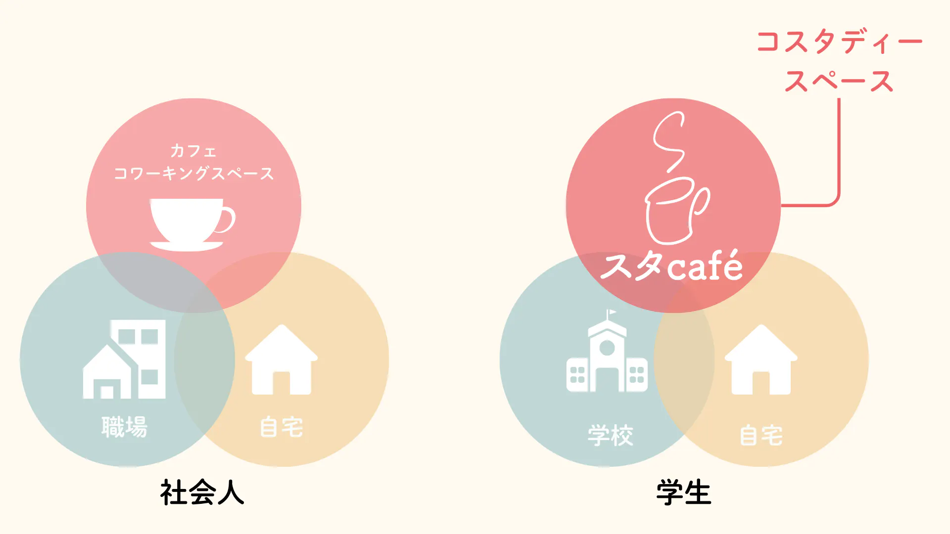 日々のストレスや責任感から離れ、ふっと息を抜いてリラックスできる場所は、私たちが生きていくうえで欠かせない場所です。大人にとってのコワーキングスペースのような場所を、学生向けに作りたい。それが、