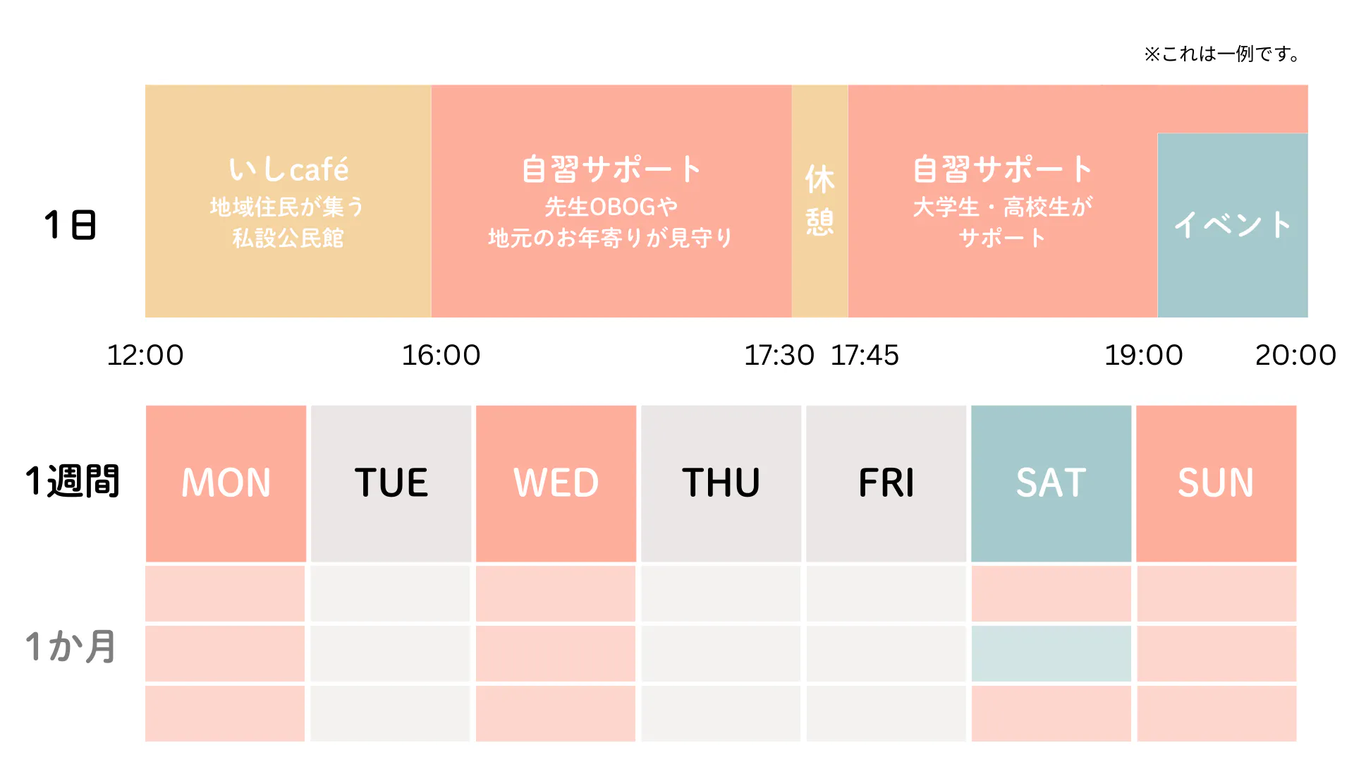 内容:中高生向け自習スペースの提供、学生と社会人・地域の方との交流イベント、勉強相談