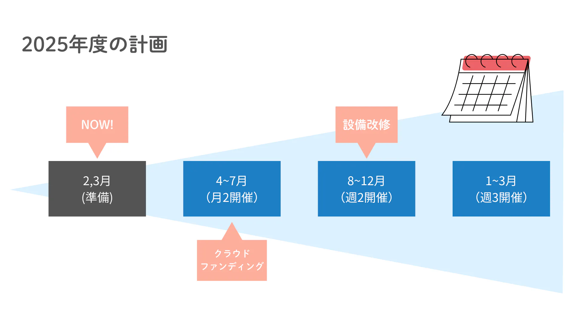 2025年度は、徐々に開催頻度を増やしながら運営を行う予定です。認知度を上げ、ノウハウを蓄積し、メンバーを増やしていくことで、持続的な開催が可能な組織体制を構築します❗