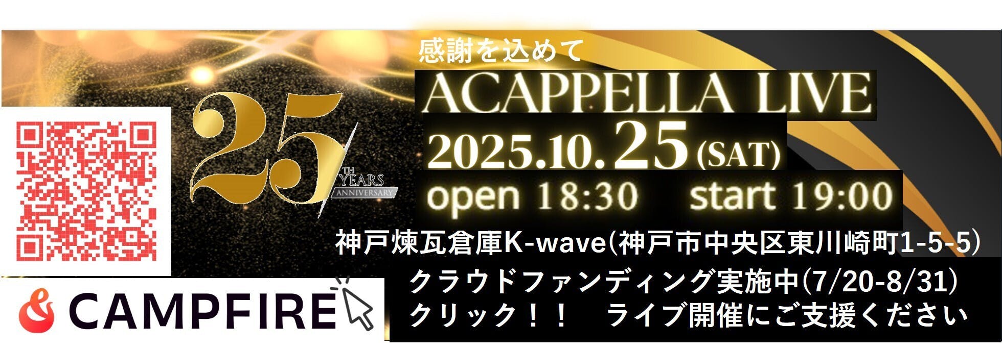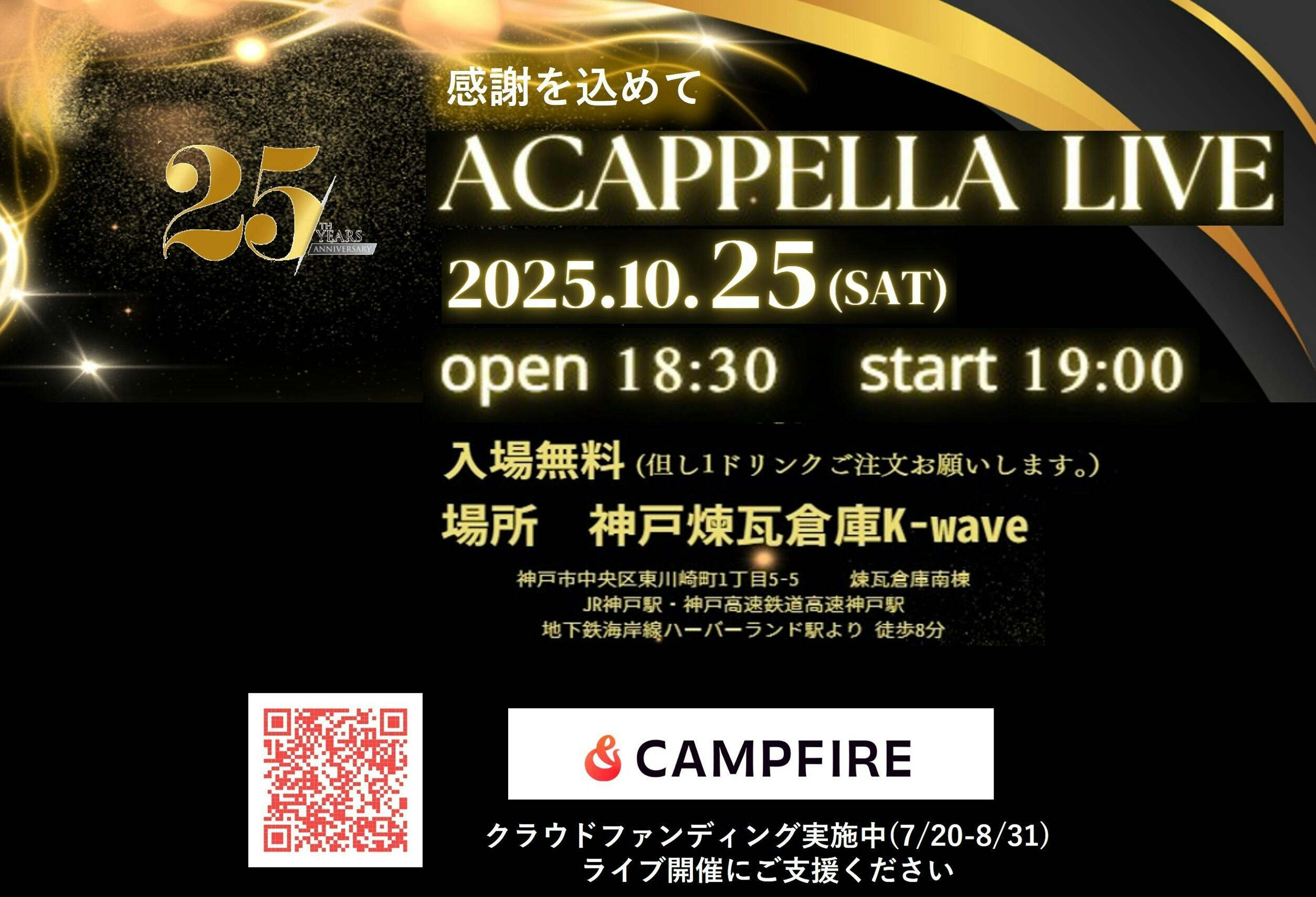こんばんは、京阪神アカペラサークルの沼田です。これからライブまでの間に数曲アップしたいと思います。第1弾は、サザンオールスターズの「涙のキッス」です。 サザンオールスターズの中でも大好きな曲で、そしてサークルの練習曲にもなりました。この曲は、サザンオールスターズ31作目のシングルで1992年7月18日に発売されています。TBS系金曜ドラマ「ずっとあなたが好きだった」の主題歌でau LISMOのキャンペーンソングでした。話はそれますが「ずっとあなたが好きだった」は、佐野史郎さん扮するエリートサラリーマンでマザコンの冬彦は1つのブームになったように思います。 今回1人アカペラをはじめて試みました。短く編集してますので数秒でもいいので聞いていただければ嬉しいです。https://www.youtube.com/watch?v=kvqZDBLE3Ms是非、クラウドファンディングにご協力ください。是非素敵なひとときを一緒に過ごしませんか?25周年感謝ライブ2025年10月25日(土)18:30開場 19:00開演神戸煉瓦倉庫K-wave〒650-0044 兵庫県神戸市中央区東川崎町1丁目5-5 煉瓦倉庫南棟JR神戸駅・神戸高速鉄道高速神戸駅、地下鉄海岸線ハーバーランド駅より徒歩8分みなさまのお越しをお待ちしています。