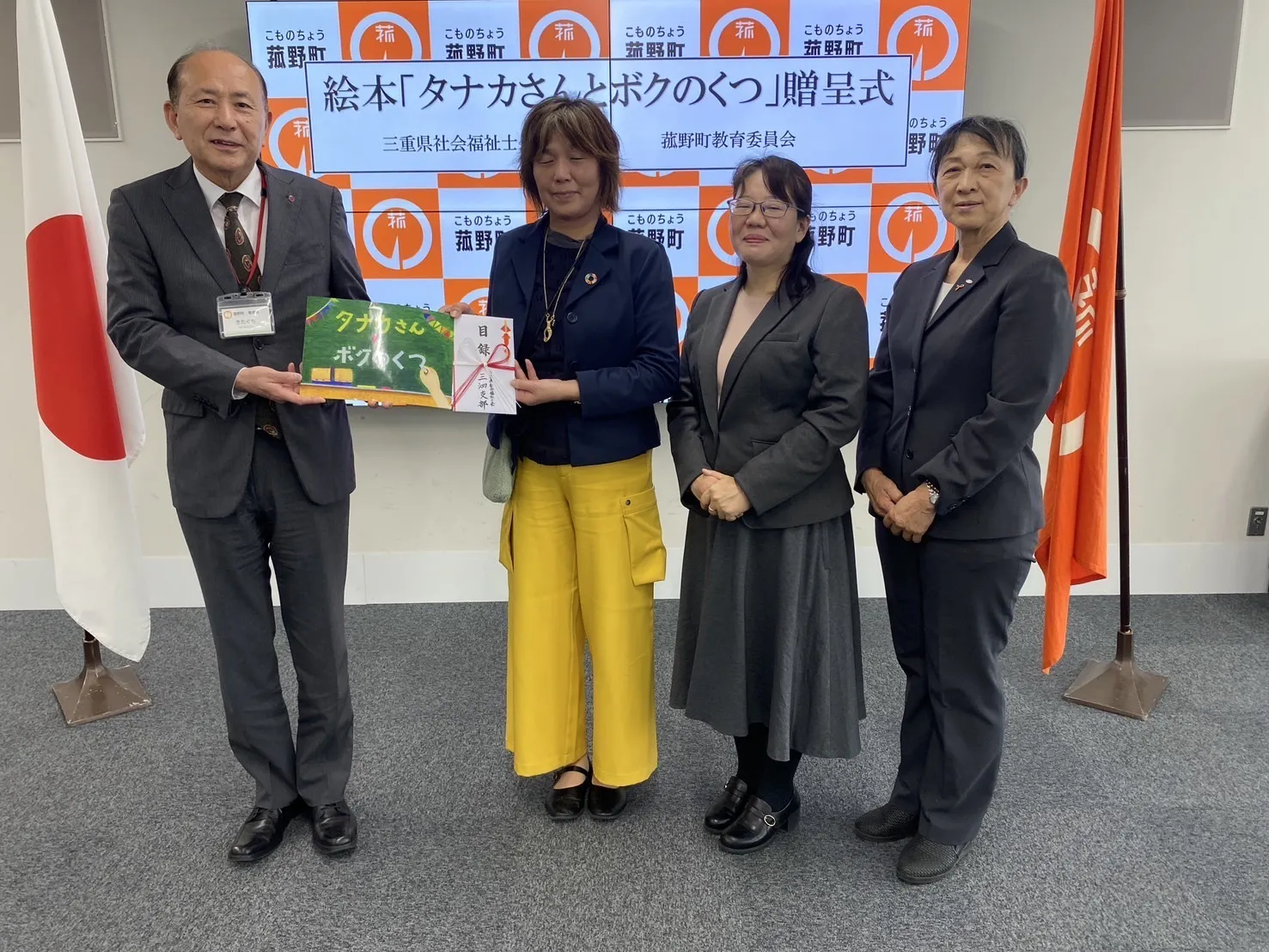 2026/03/30 12:002か月以上ご報告の間隔が空いてしまいました。絵本プロジェクトメンバーで現役スクールソーシャルワーカーのかとうとしえです。去る12月19日(金)に、三重県内の児童養護施設に、私たちの絵本「タナカさんとボクのくつ」が寄贈される場面に、絵本プロジェクトのメンバーが立ち会わせて頂きました。話は少しややこしいのですが、もともと絵本プロジェクトの寄贈先の1つであった一般社団法人三重県社会福祉士会が、三重県内の児童養護施設に絵本を寄贈することになり、この寄贈はNPO法人子どもの自立を支援する会・くれよん様の仲介で実現したものでした。くれよん様は、児童養護施設で暮らすこどもたちの未来を支援する団体で、「社会福祉士さんたちとかかわりを持ちたい」という思いがあり、偶然私たちのクラウドファンディングを見つけていただいて、この児童養護施設への寄贈のセッティングを行っていただいたのです。当日は、三重県児童養護施設協会自立支援部会の会議の前に、贈呈式を行わせて頂きました。児童養護施設にも社会福祉士は働いていますが、職員の中心はやはり保育士さんです。今回の会議にも、それぞれの施設の保育士の方々が出席されていましたので、三重県社会福祉士会の平井会長から、ぜひ社会福祉士資格の取得も!と、期待を込めたメッセージがありました。くれよん様からは、児童養護施設を退所したこどもたちの支援を、今後拡大していきたいと考えていらっしゃるとお話を伺いました。三重県社会福祉士会としても、今回のご縁をきっかけに、児童養護施設とのネットワークをさらに強固なものとするとともに、退所したこどもの自立支援にもできる範囲で協力したい意向を伝えました。もちろん、一人ひとりの社会福祉士が、こどもへの伴走支援にもっと目を向けていくべき課題であることも確認しました。今回は、私たちが絵本を寄贈した団体が、別の団体に絵本を贈呈する、という形でしたが、オリジナル絵本というツールが、職種を越えた新しい架け橋になることを予感させるひとときとなりました。余談ではありますが、NPO法人子どもの自立を支援する会・くれよんの監事様からは、「絵本を見た瞬間にデジタル描画でないことは一目で分かったけれど、まさかオール手描きとは!」と驚かれたことも印象的な出来事でした。私たちは絵本を描くと言ったら、何も検討せずに画用紙を買ってきていしまったのです。それは絵本作家さんの原画展が脳裏に残っていたからなのかな?とも思いました。(そもそもデジタルの作家さんは原画展をしないのかもしれませんが…)そして、私たちも図々しくも会場をお借りして原画を展示させていただきました。さすが保育士さん!原画にも興味津々で、丁寧に観てくださいました。絵本が強くするネットワークの可能性をみせていただいた一日になりました。関係者の皆様、ありがとうございました! もっと見る