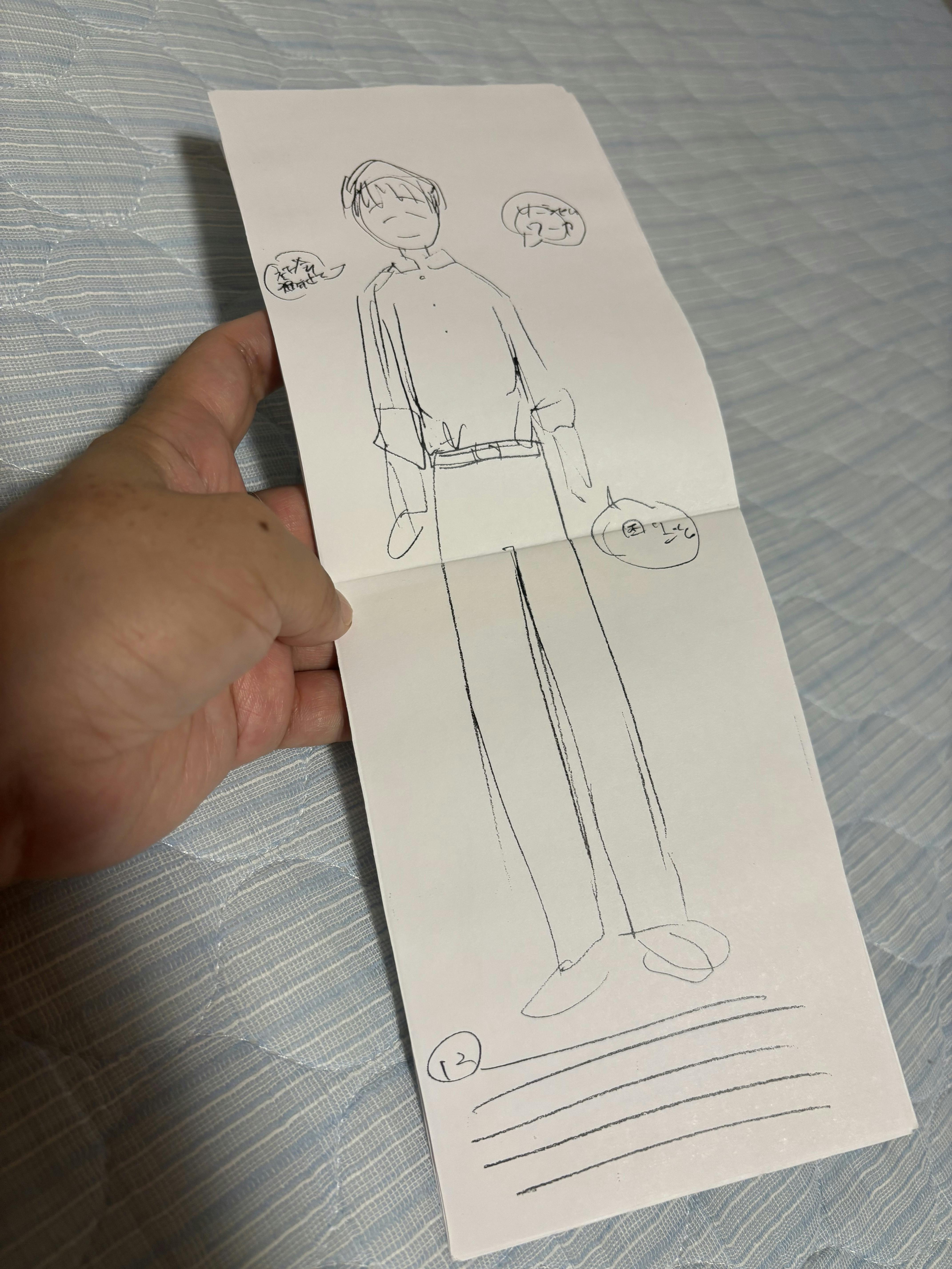 そして、さくらいさんがざっと作ってくれた絵コンテをもとに、まずはコピー用紙で原寸の4分の1サイズのミニ本を作成(今回のトップ画像がそのミニ本です)。