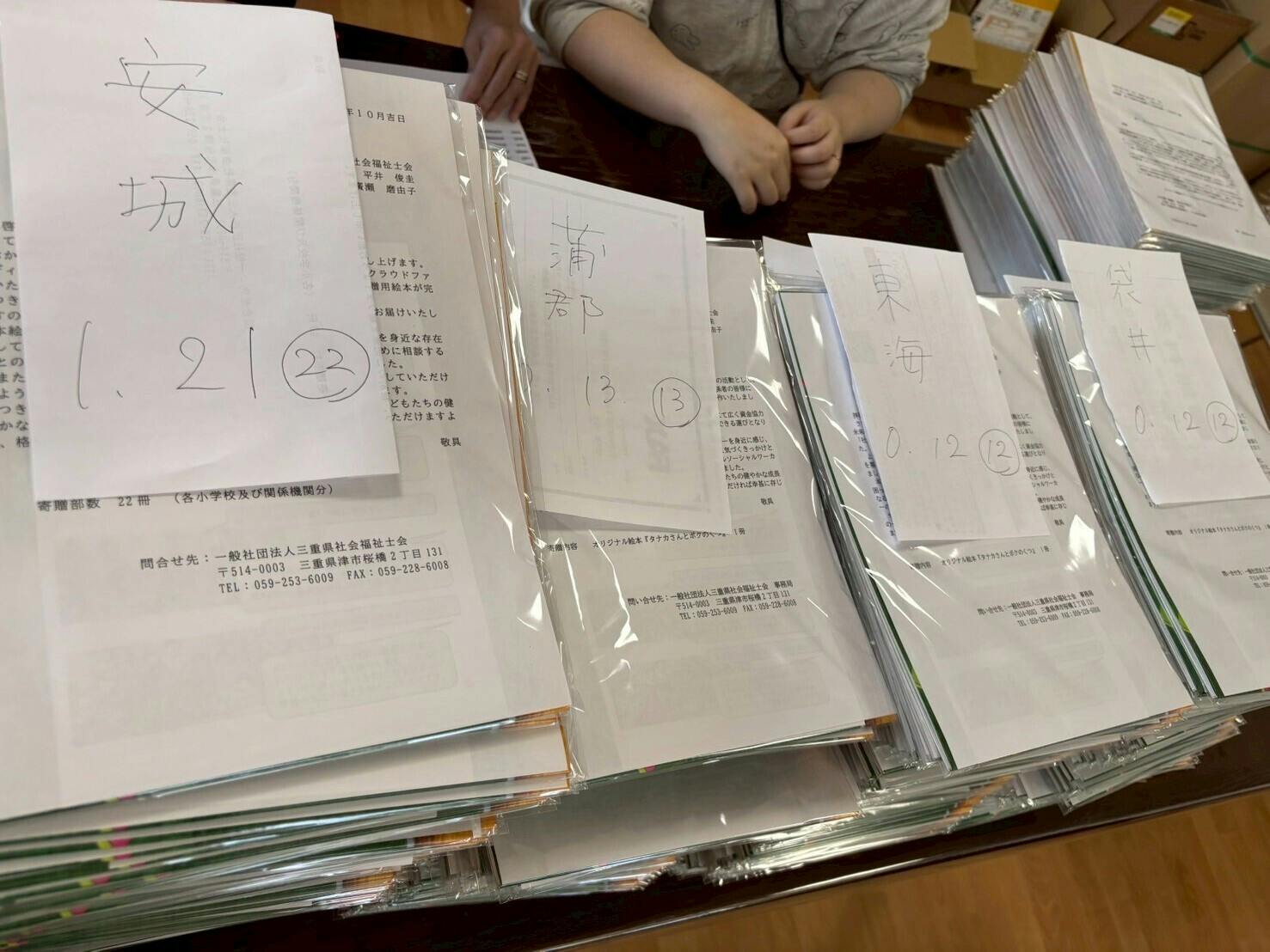 (市の名前が手書きされて仕分けされていて、いよいよ絵本が旅立つのだと実感がわいてくる、個人的に好きな写真です。)