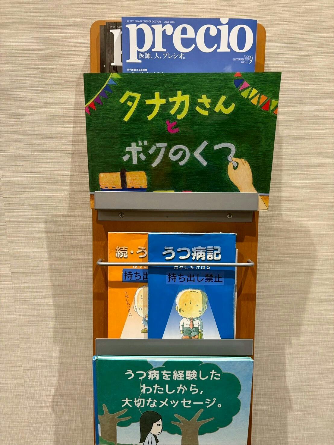 こちらは私たちが主に活動をしている三重県四日市市内のクリニックの待合室のラックです。院長先生のご厚意で置かせていただけることになりました。