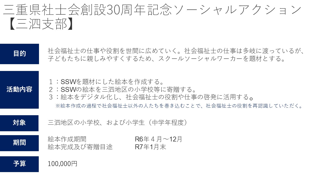 こんにちは!絵本プロジェクトの やまぎしみゆき(文章担当)です。いつもあたたかいご支援ありがとうございます!ここからはしばらく、プロジェクトページには書ききれなかった、やまぎしみゆきの個人的なプロジェクトの制作秘話(というか思い出話?)を綴っていこうと思います。長いシリーズになりますが、よろしくお付き合いください。さて、時は2024年2月。月に一度の三重県社会福祉士会三泗支部交流会。私は悩んでいました。当時の支部長から、「三重県社会福祉士会設立30周年を記念して各支部で何かのソーシャルアクションをやらなければならない」「支部会員から企画書の案を募集したが、案を出したのはやまぎしさんだけだった」とのことでした。ソーシャルアクションとは、ソーシャルワーカーである社会福祉士が、広い視点で、世の中の変革をもたらす全ての活動を指します。私は、「社会福祉士の知名度向上のため『絵本』を作って、配る」としました。なぜ絵本だったのか。それは私の経験上、公的機関(小学校など)に「絵本を寄贈します」と言えば、きっと断られないだろうという目論見があったからです。現に、さまざまな団体から、毎年のように絵本の寄贈を受けています。もう1つ、私には、とてもつまらない意地がありました。三重県の県庁所在地は津市です。しかし、最大人口を有するのは三泗支部を構成する四日市市です。どうせやるなら、県内9支部のうち、三泗支部が「てっぺん」をとりたかったのです。さて、なんやかやで期日が迫り、急ぎ三重県社会福祉士会に提出した、各支部の2025年度のソーシャルアクション企画書案が冒頭の写真です。この時点では、賛同者もいなければ絵本作りのノウハウもありません。ただ、私しか案を出さなかった。それだけで三泗支部を代表してしまってよいものか…と葛藤のままに、この「絵本プロジェクト」(当時は名前もなかった…)は不安なスタートを切りました。さて、ここから絵本を作り始めるドタバタ劇が始まりますが、それはまた次回以降に…。さて、クラウドファンディングは118人の方からご支援をいただきました!本当にありがとうございます。ひきつづき、1人でも多くのこどもたち、こどもに関わる全ての人に絵本を届けるために、どうかご支援や周知・拡散をよろしくお願いいたします!