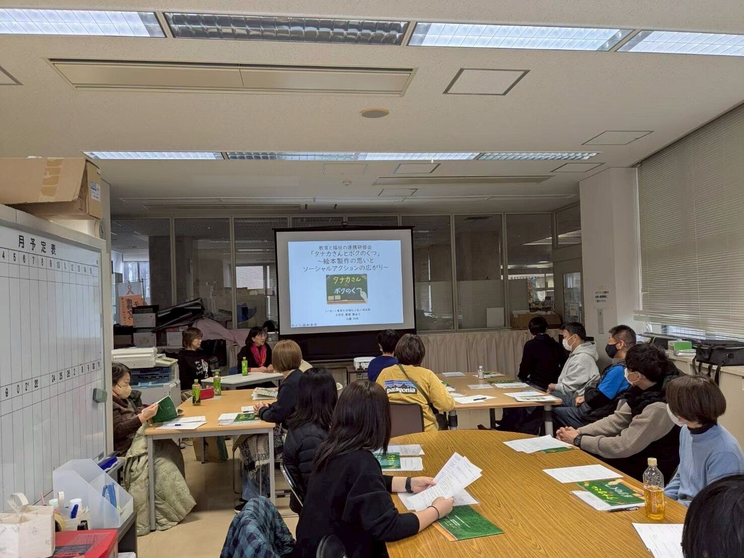 2026/03/30 12:002か月以上ご報告の間隔が空いてしまいました。絵本プロジェクトメンバーで現役スクールソーシャルワーカーのかとうとしえです。去る12月19日(金)に、三重県内の児童養護施設に、私たちの絵本「タナカさんとボクのくつ」が寄贈される場面に、絵本プロジェクトのメンバーが立ち会わせて頂きました。話は少しややこしいのですが、もともと絵本プロジェクトの寄贈先の1つであった一般社団法人三重県社会福祉士会が、三重県内の児童養護施設に絵本を寄贈することになり、この寄贈はNPO法人子どもの自立を支援する会・くれよん様の仲介で実現したものでした。くれよん様は、児童養護施設で暮らすこどもたちの未来を支援する団体で、「社会福祉士さんたちとかかわりを持ちたい」という思いがあり、偶然私たちのクラウドファンディングを見つけていただいて、この児童養護施設への寄贈のセッティングを行っていただいたのです。当日は、三重県児童養護施設協会自立支援部会の会議の前に、贈呈式を行わせて頂きました。児童養護施設にも社会福祉士は働いていますが、職員の中心はやはり保育士さんです。今回の会議にも、それぞれの施設の保育士の方々が出席されていましたので、三重県社会福祉士会の平井会長から、ぜひ社会福祉士資格の取得も!と、期待を込めたメッセージがありました。くれよん様からは、児童養護施設を退所したこどもたちの支援を、今後拡大していきたいと考えていらっしゃるとお話を伺いました。三重県社会福祉士会としても、今回のご縁をきっかけに、児童養護施設とのネットワークをさらに強固なものとするとともに、退所したこどもの自立支援にもできる範囲で協力したい意向を伝えました。もちろん、一人ひとりの社会福祉士が、こどもへの伴走支援にもっと目を向けていくべき課題であることも確認しました。今回は、私たちが絵本を寄贈した団体が、別の団体に絵本を贈呈する、という形でしたが、オリジナル絵本というツールが、職種を越えた新しい架け橋になることを予感させるひとときとなりました。余談ではありますが、NPO法人子どもの自立を支援する会・くれよんの監事様からは、「絵本を見た瞬間にデジタル描画でないことは一目で分かったけれど、まさかオール手描きとは!」と驚かれたことも印象的な出来事でした。私たちは絵本を描くと言ったら、何も検討せずに画用紙を買ってきていしまったのです。それは絵本作家さんの原画展が脳裏に残っていたからなのかな?とも思いました。(そもそもデジタルの作家さんは原画展をしないのかもしれませんが…)そして、私たちも図々しくも会場をお借りして原画を展示させていただきました。さすが保育士さん!原画にも興味津々で、丁寧に観てくださいました。絵本が強くするネットワークの可能性をみせていただいた一日になりました。関係者の皆様、ありがとうございました! もっと見る
