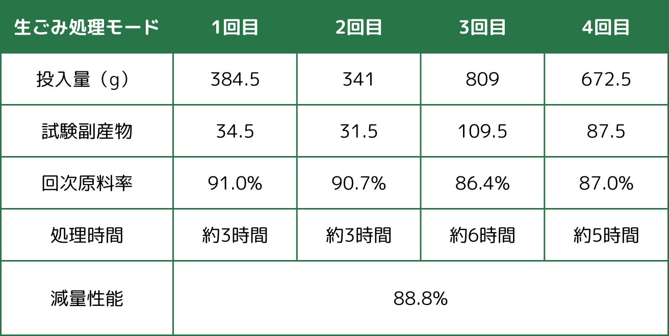 粉砕と、乾燥温度120℃の高温乾燥からなる2つのアプローチで生ごみに含まれる水分を効率的に蒸発、乾燥させ約88.8%もの減少率を実現します。