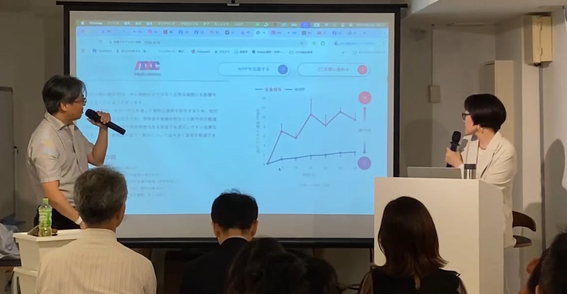 小野澤からは当社が現在取り組む「NIPPの保険適用を目指すクラウドファンディング」への挑戦のリアルを語りました。三間氏が紹介したクラウドファンディング成功の本質と、現在4thゴールを目指して進行中のNIPPのクラウドファンディングには、多くの共通点が見られました。