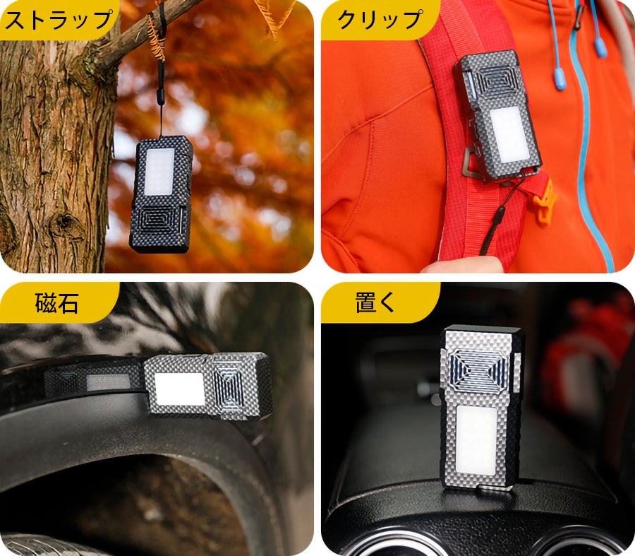 吊るす・マグネット固定・背負う・置くなど自由自在に使え、テント内や車内、釣り場、ベランダまであらゆる場所で「蚊からの解放」を実現します。