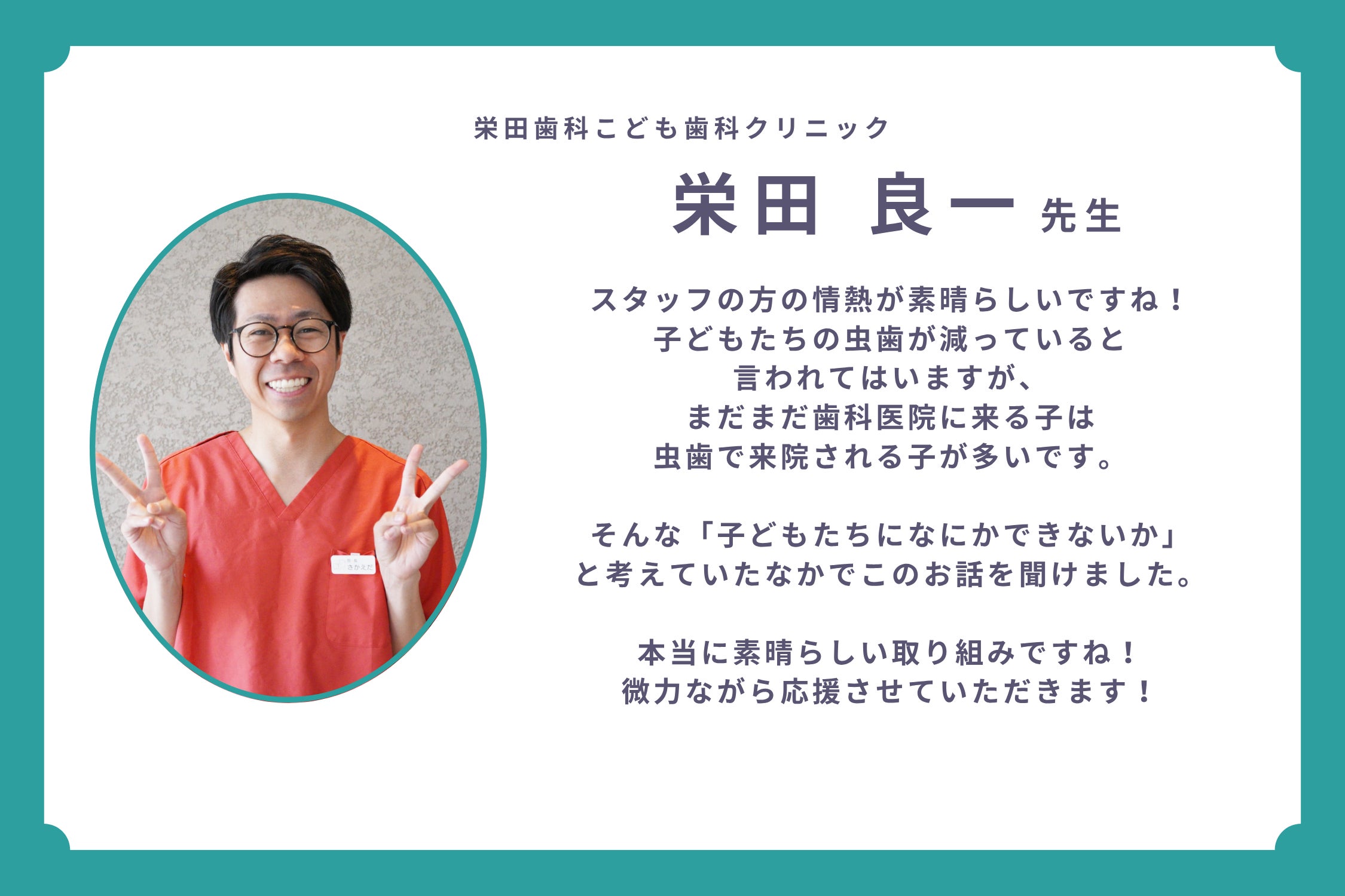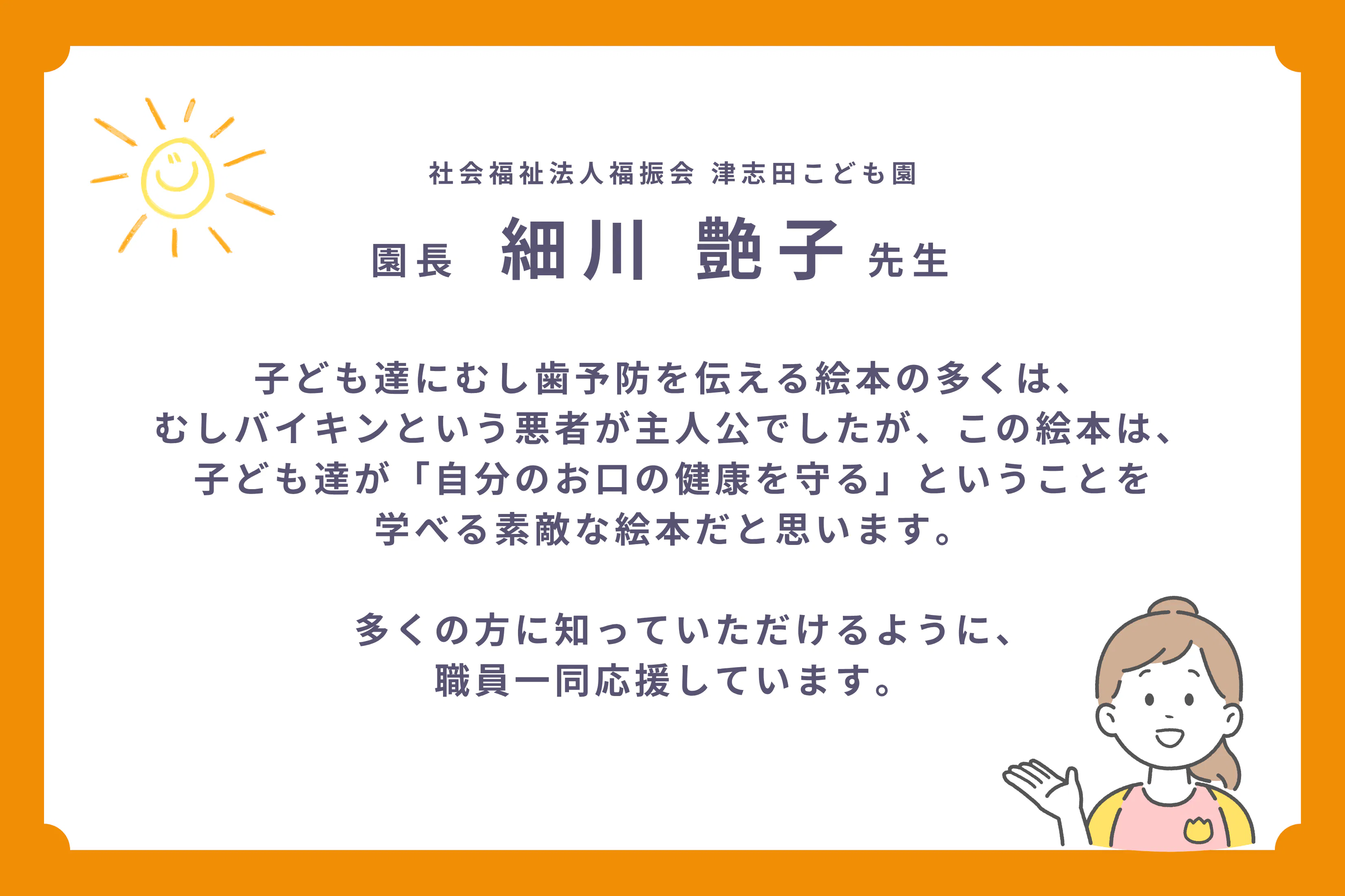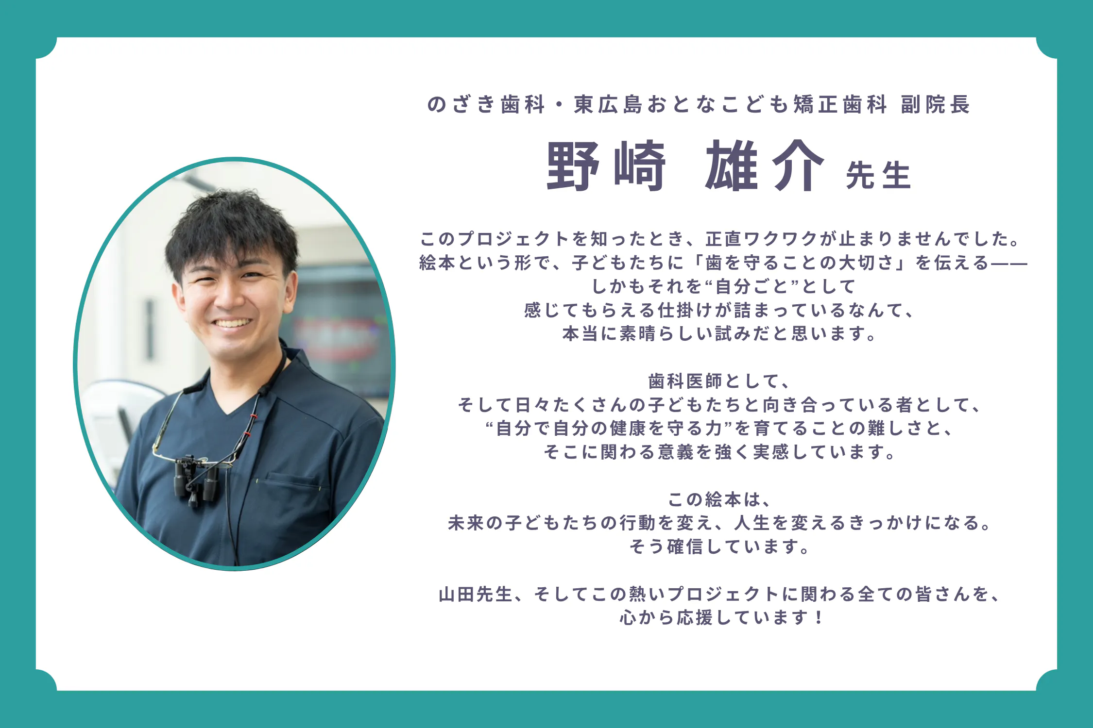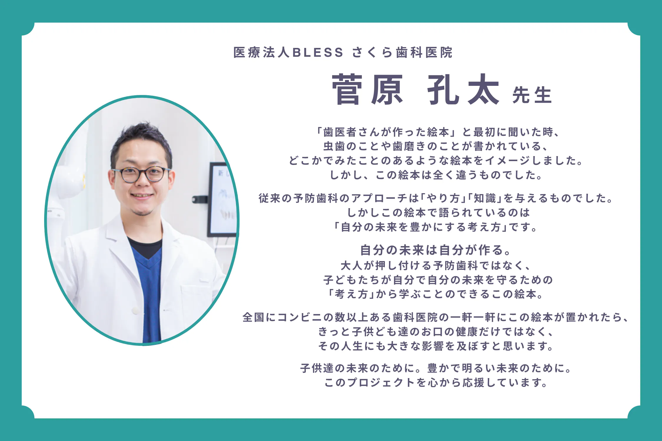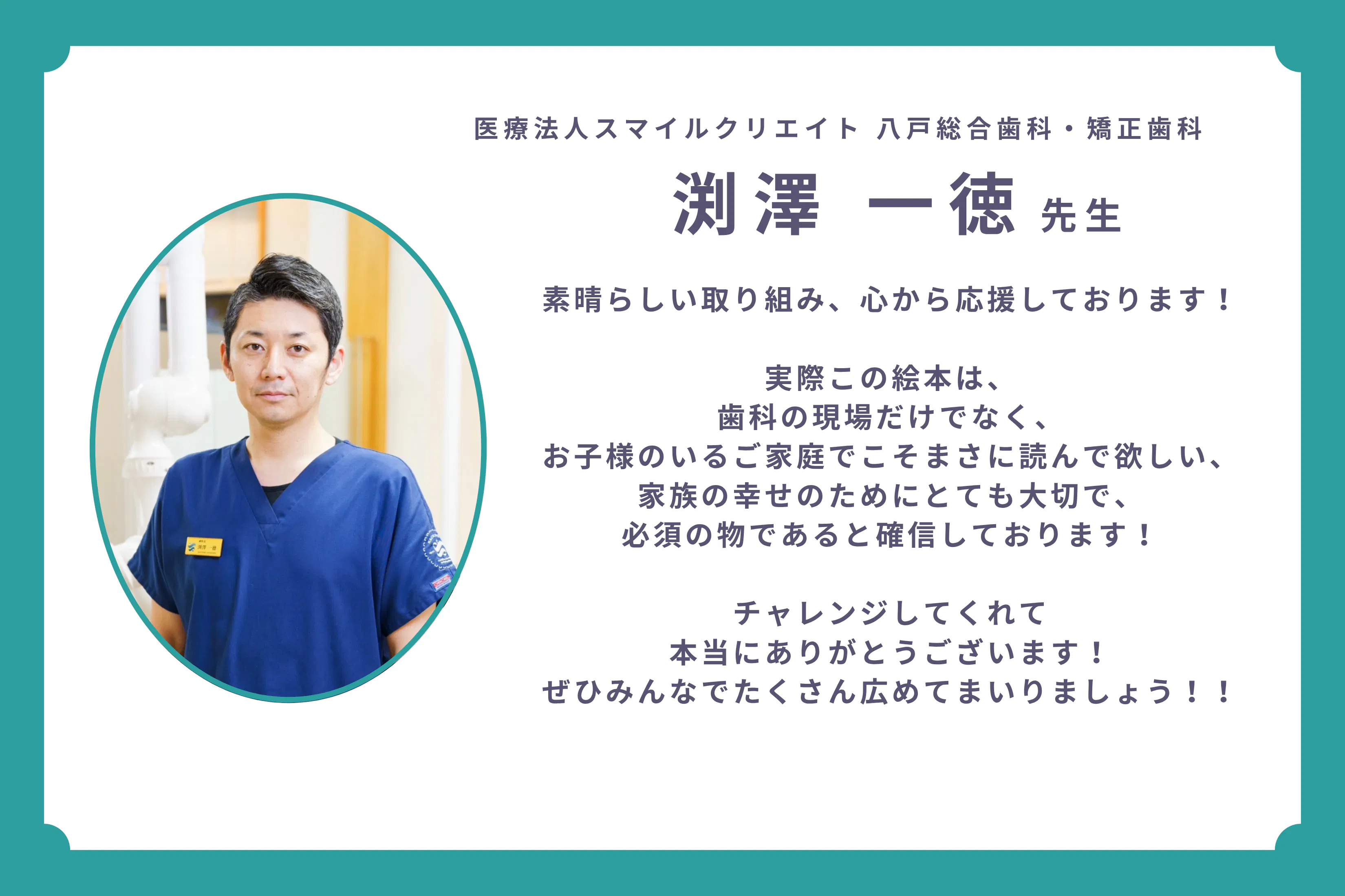 歯科衛生士として、一人でも多くの子どもにこの絵本が届き、自分の歯を大切にする“当たり前”が広がっていくことを心から願っています。