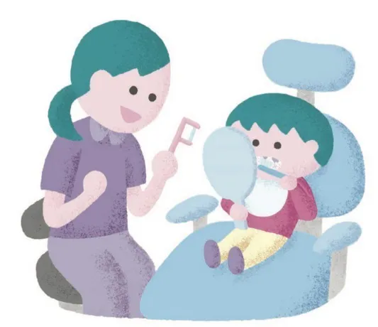歯科衛生士さんに正しい歯みがきやフロスの使い方を教えてもらい、「おやつは時間を決めて食べる」「フッ素入りの歯みがき粉を使う」など、大切なことを一つひとつ学んでいきます。