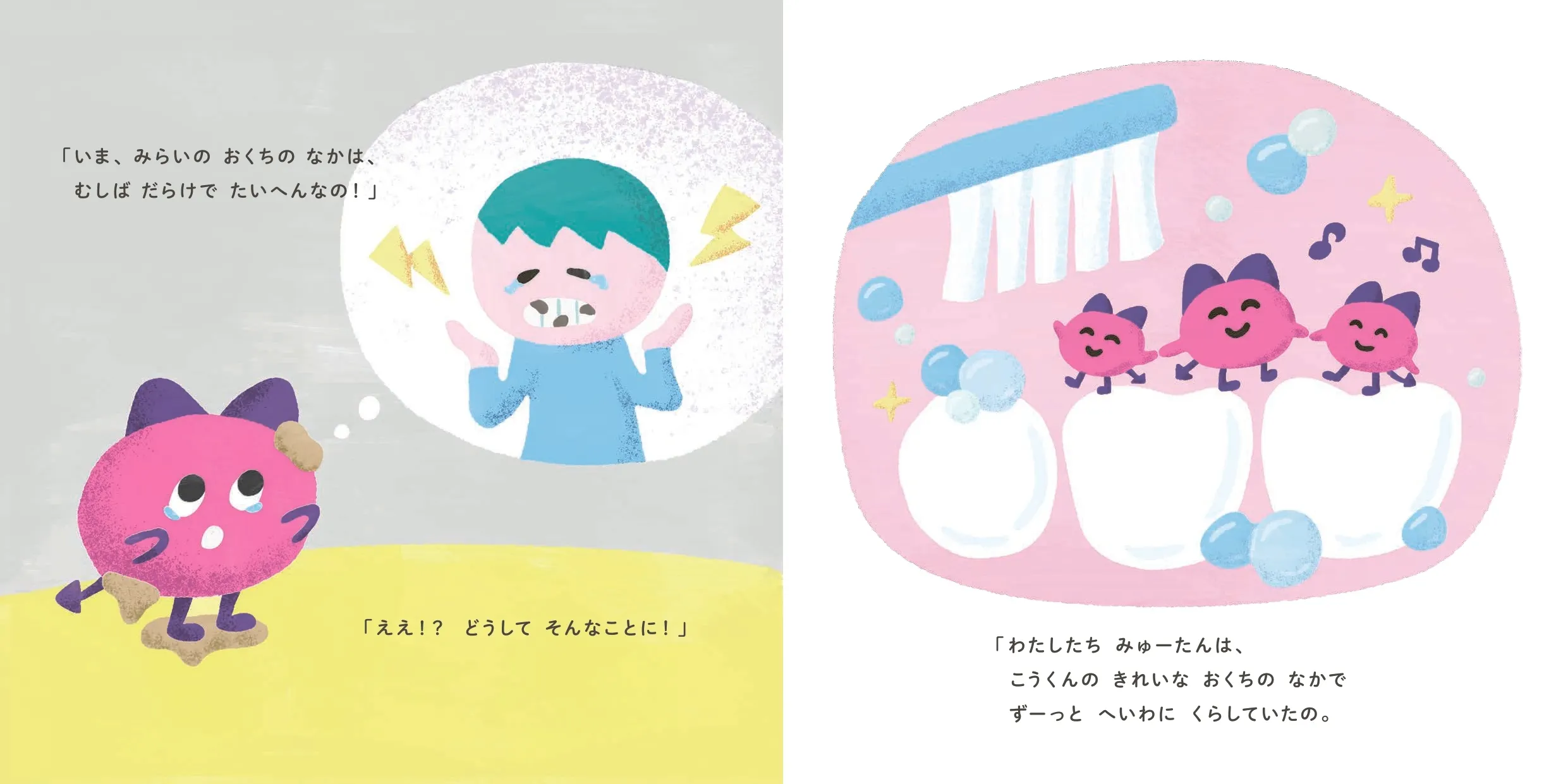 みゅーたんはこうくんに、未来の自分の口の中がむし歯だらけになってしまったこと、そしてその原因は甘いおやつの食べすぎと、歯みがきをさぼった毎日だったことを教えてくれます。