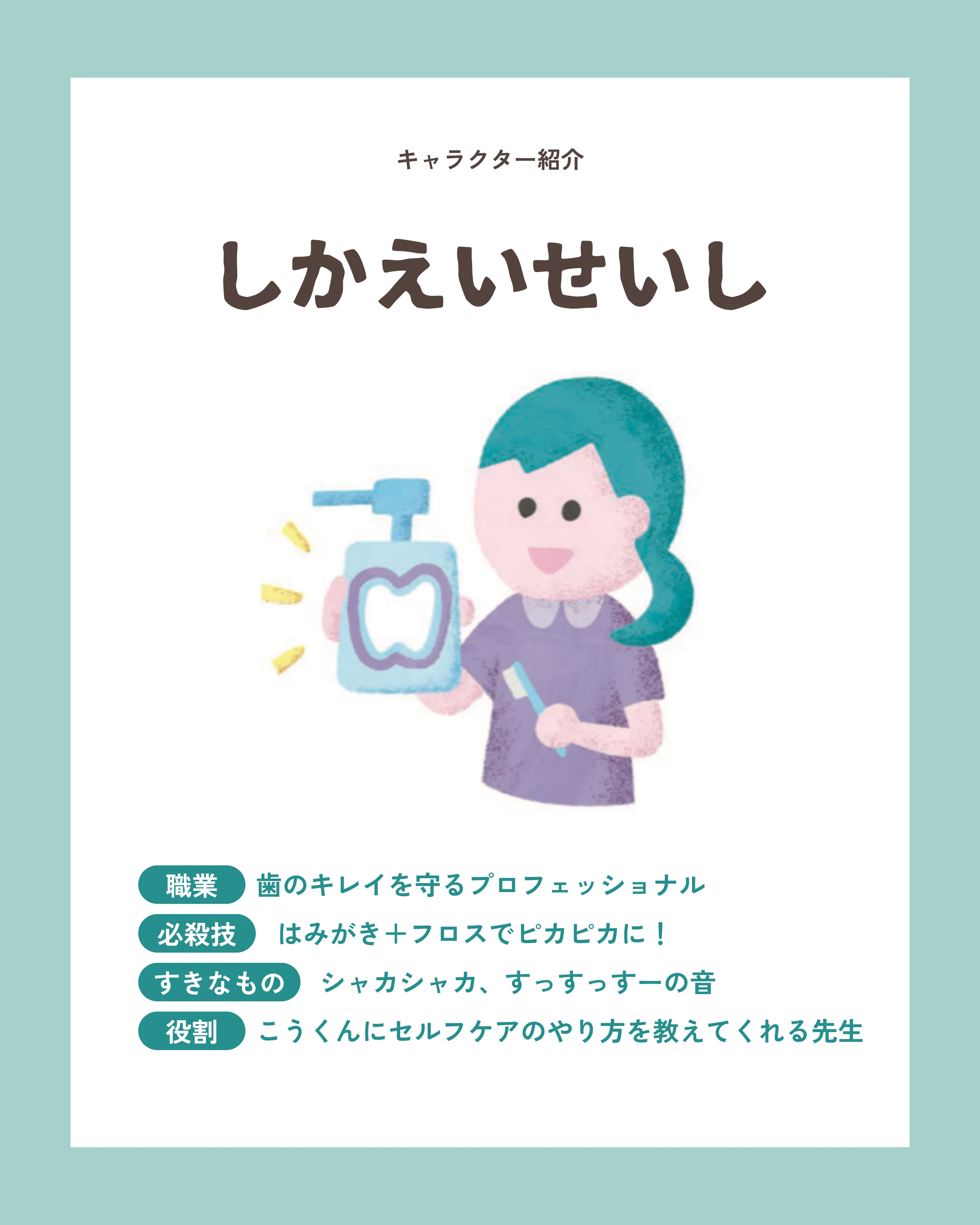 この絵本は、子どもたちが自分のペースで、おうちでセルフケアに取り組んだり、歯医者さんに行くことを前向きに感じられるようにと、願いを込めて作ったものです。