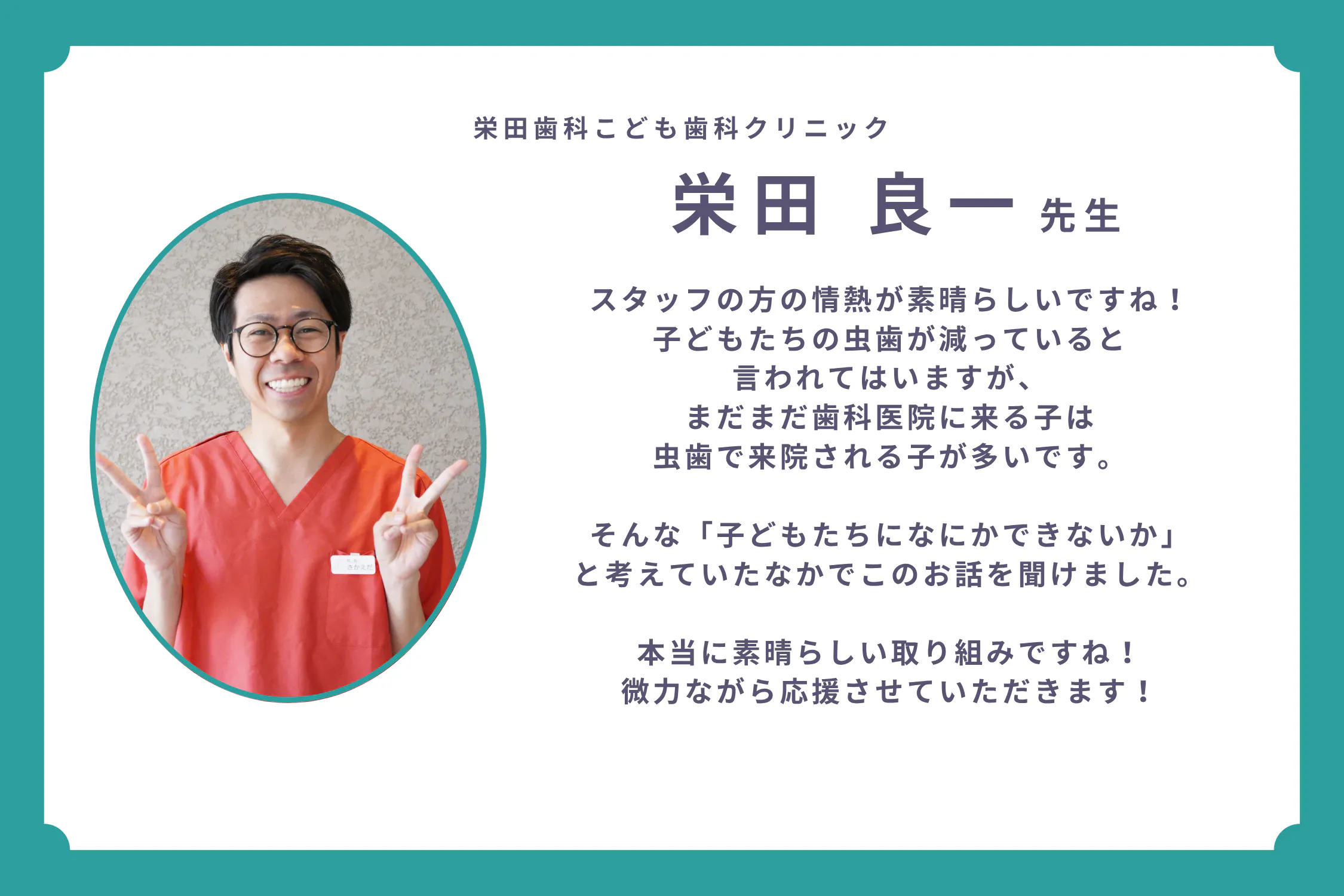2025/06/07 09:00ご支援、応援をいただいている方々より、数々の応援メッセージを頂戴しております。本当にありがとうございます。こちらの活動報告でご紹介してまいります!-----------------------医療法人スマイルクリエイト 八戸総合歯科・矯正歯科 副院長渕澤 一徳先生素晴らしい取り組み、心から応援しております!実際この絵本は、歯科の現場だけでなく、お子様のいるご家庭でこそまさに読んで欲しい、家族の幸せのためにとても大切で、必須の物であると確信しております!チャレンジしてくれて本当にありがとうございます!ぜひみんなでたくさん広めてまいりましょう!!プロジェクトページはこちら▶︎https://camp-fire.jp/projects/842929/view もっと見る