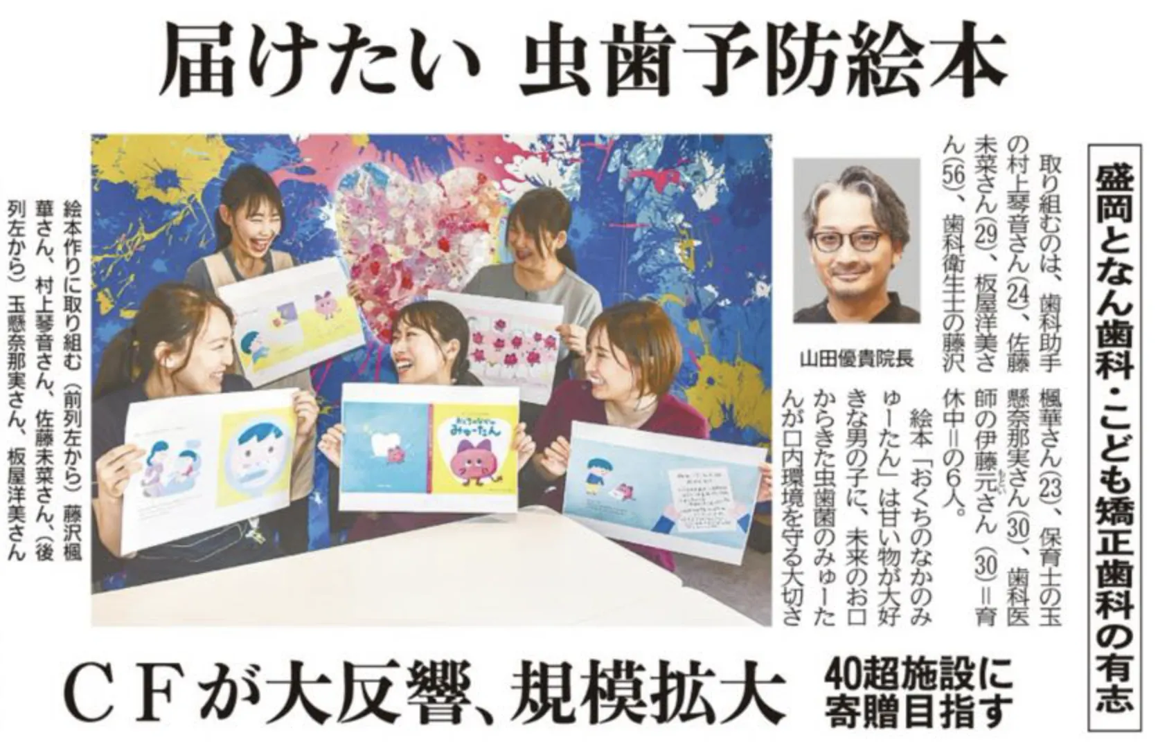 2025/06/10 10:19皆さま、いつも温かいご支援と応援をありがとうございます。本日、私たちのオリジナル絵本プロジェクトが 岩手日報 に掲載されました!クラウドファンディングを通じて、多くの方々に想いや活動の背景を届けたいと願っていた中で、今回このように地元紙に取り上げていただけたことを大変うれしく思います。記事では、絵本制作に込めた想いや、プロジェクトのきっかけ、目指している未来について丁寧に紹介していただいています。私たちの活動がより多くの方に届くきっかけになればと願っています。ぜひご覧いただき、引き続きの応援をよろしくお願いいたします!※記事の詳細は著作権の関係で掲載できませんが、岩手日報をご覧いただける方は、6月10日(火)の紙面をぜひチェックしてみてください。▶︎プロジェクトページはこちらhttps://camp-fire.jp/projects/842929/view もっと見る【応援メッセージご紹介④】医療法人スマイルクリエイト 八戸総合歯科・矯正歯科 副院長 渕澤 一徳先生