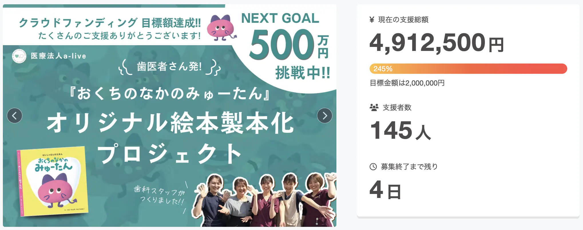 そしてここからは、より多くの子どもたちにこの絵本を届けるべく、ネクストゴール500万円を目指して活動を広げていきます!