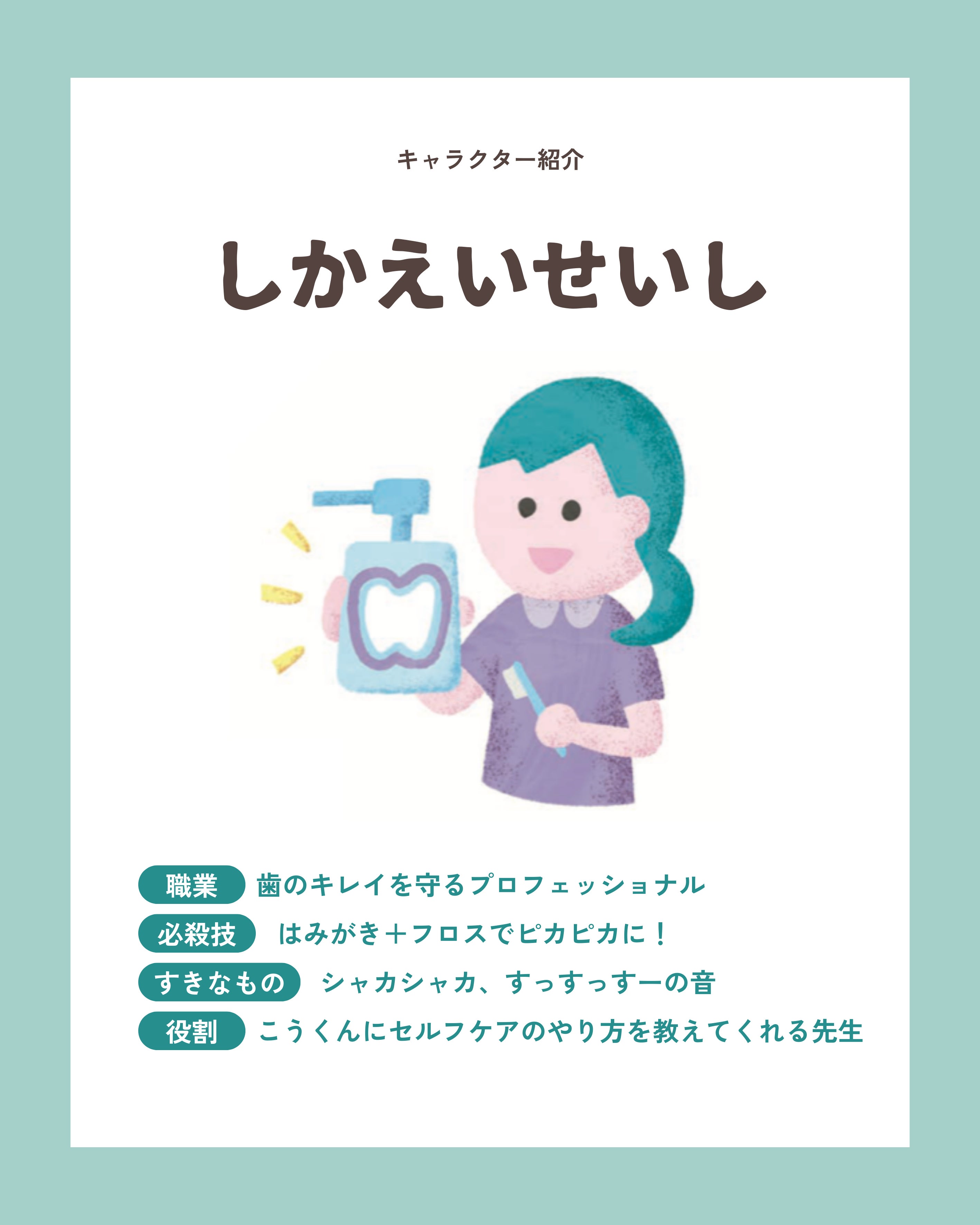 この絵本は、子どもたちが自分のペースで、おうちでセルフケアに取り組んだり、歯医者さんに行くことを前向きに感じられるようにと、願いを込めて作ったものです。