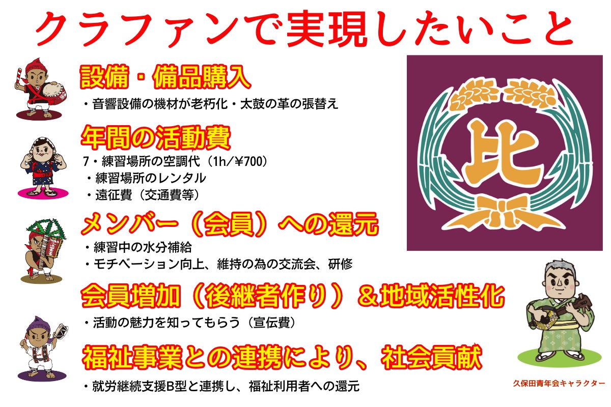 これらの費用は、私たちの活動の質を維持し、地域の伝統文化を次世代へと受け継いでいくために必要不可欠です。しかし、現状では演舞出演代や地域の方々からの寄付金が主な収入で、その収入は不安定です。そのため、クラウドファンディングを通じて、さらなる支援を募ることにしました。皆様のご支援があれば、私たちはさらに多くの活動を展開し、地域の活性化に貢献できると信じています。久保田青年会の一員として、地域の未来を担う若者たちが活躍できる場を提供し続けることが、私たちの使命です。これからも地域の皆様と共に成長し、伝統を守り続けるために精一杯努力して参りますので、どうぞ温かいご支援をよろしくお願い申し上げます。