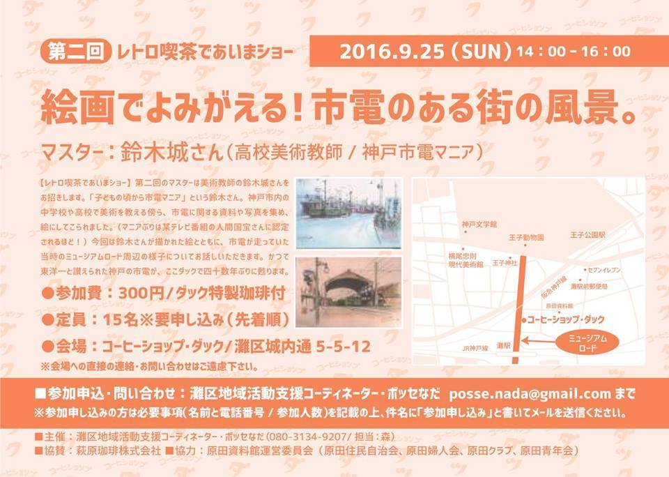 ポッセなだでは、ミュージアムロード沿いにある閉店した喫茶店「喫茶ダック」を不定期でお借りし、ミュージアムロードや地域にまつわる方々を”マスター”と称して、カウンタートークイベントを開催しています。これまでのマスターには、神戸市王子動物園の副園長さんや兵庫県立美術館の館長、横尾忠則現代美術館の学芸員さんとのコラボでトーク&美術館巡りなどを行いました。さらに、まさにこの地域から出発したという「萩原珈琲」の社長さんや最近新たにこの界隈でお店を開店した若手オーナーのトーク&お店巡り、などです。新旧住民のみなさんが、この機会にお互いを知る場を作っています。
