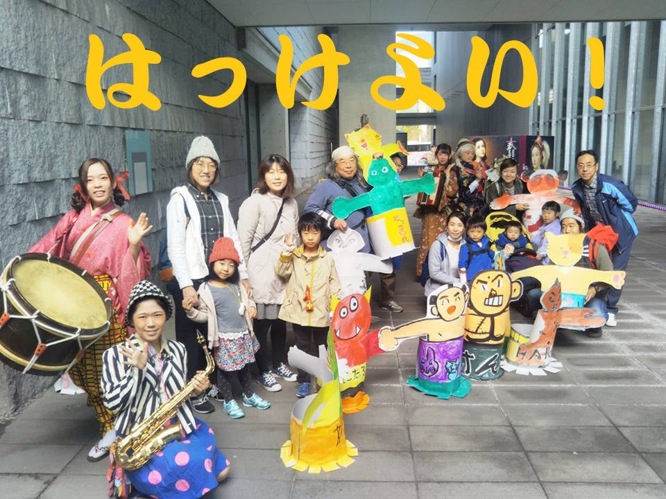 その他、巨大紙相撲大会の全身となる巨大トランクを使った「音あそびワークショップ」を開催。自分たちで楽器を作り、夢の巨大トランクをみんなで運びました!