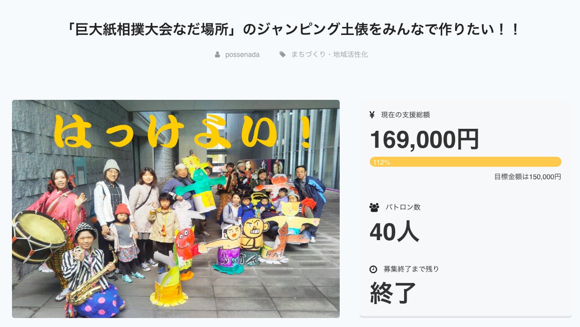 先ほど、私たちのチャレンジが終了いたしました。 結果は、、、 目標金額15万を超えた 「169,000円が、40名のパトロンの方によって集まりました。」 加えてご自身のFBで、宣伝協力くださったり、突然のお願いメッセージに応援の言葉をくださったり。みなさま、お騒がせいたしましたが、数々のご協力を本当にありがとうございました。 巨大紙相撲大会inなだ場所が、灘の名物イベントに育てたい!この大きな目的の一歩を、40名プラス@の方々とこうして達成できたことを励みに、みなさんと一緒に育て上げていくことをこころ新たに! 簡単ではありますが、ひとまずの心からの御礼まで。 ポッセなだメンバー一同