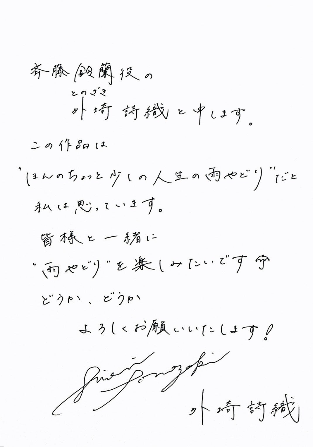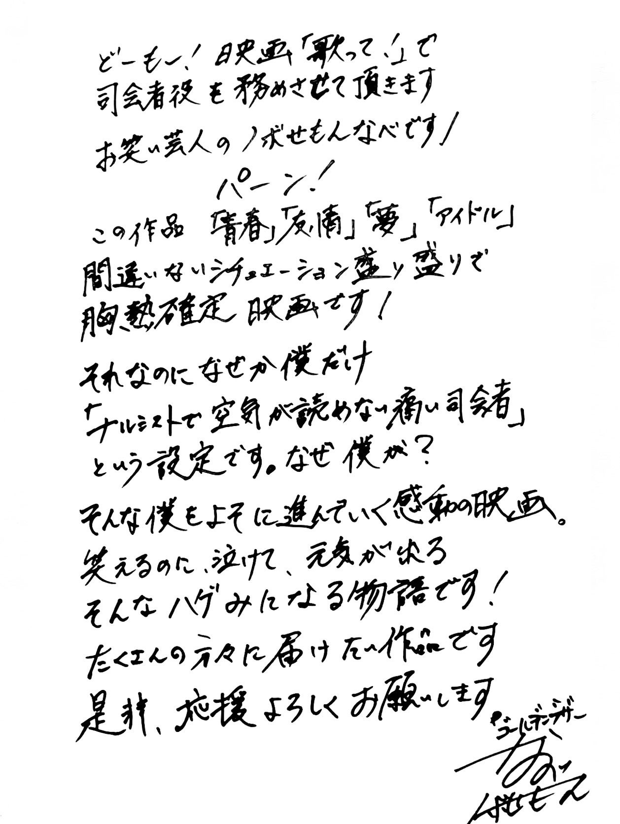 長文ながら読んでいただき、ありがとうございます。「この映画を応援してよかった」と思えるように、出演者・スタッフ一同、この映画プロジェクトに全力で取り組んでおります。皆さまのあたたかいご支援を心よりお待ちしております。