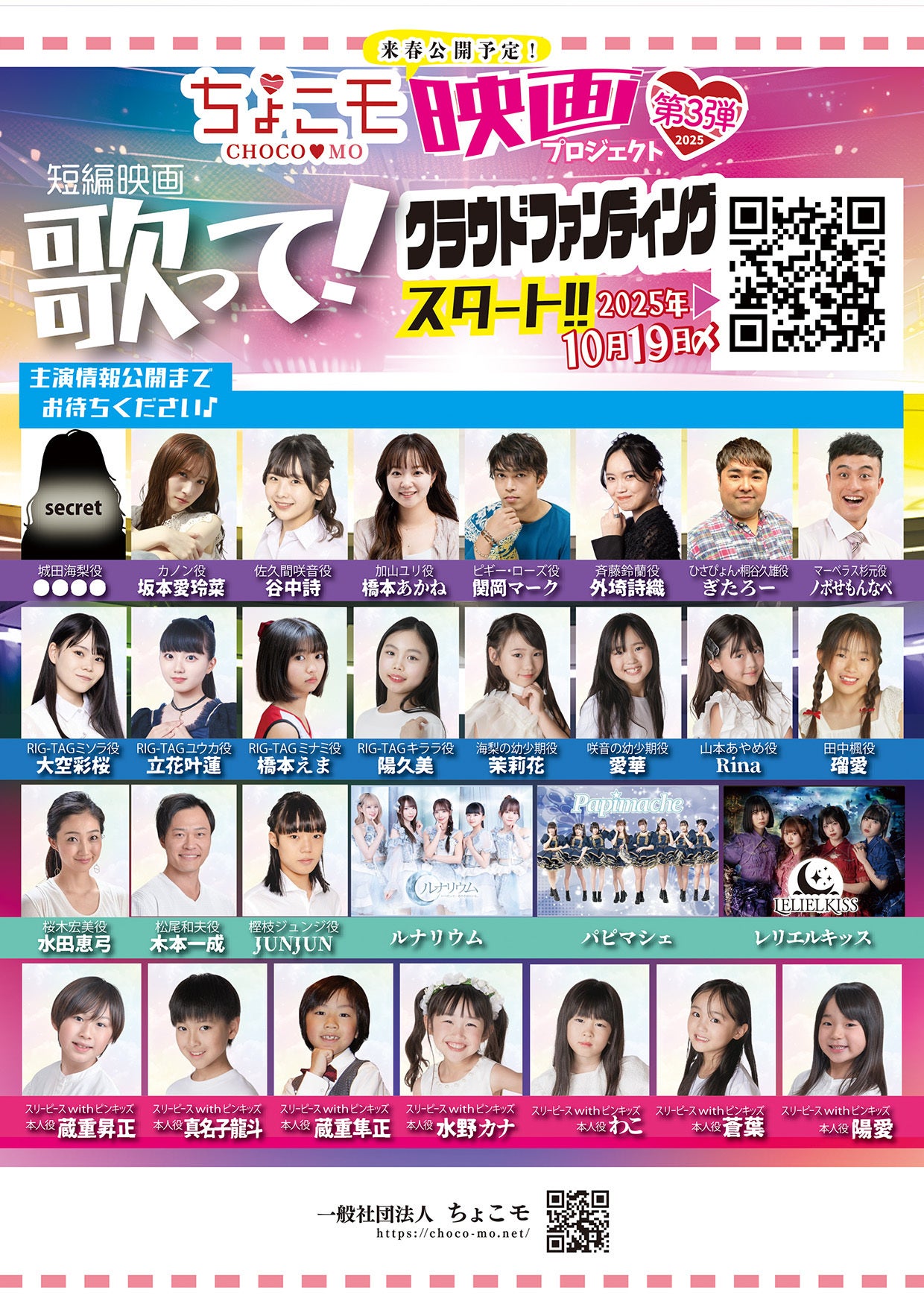 一般社団法人ちょこモです。ちょこモは2016年11月に誕生し、今年で9年目を迎えました。ちょこっとモデルサークル「ちょこモ」では、まずはちょこっとからはじめてみよう!をテーマにキッズからシニアまでの幅広い世代の「輝きたい!!」を応援すべく、芸能活動の学びや活躍の場をたくさん作ってきました。これまでミュージカル・ファッションショー・アイドルライブ・短編映画・TikTokドラマなどの製作を進めて参りましたが、今年は更に映画への想いを集約し、九州から世界へ発信すべく作品作りへの階段をのぼり始めました!是非、一般社団法人ちょこモならびにちょこモ映画プロジェクト第3弾への応援を宜しくお願い致しします。 ちょこモ映画プロジェクト総指揮 桑奈みみ