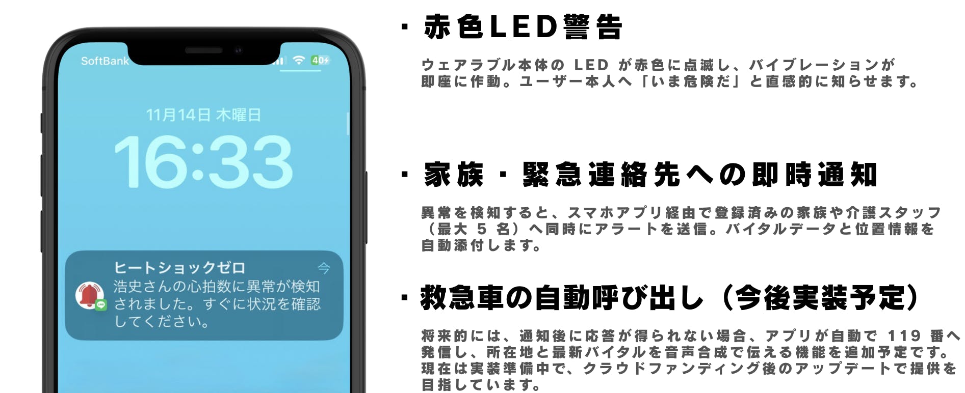異常をすぐに家族や緊急連絡先に知らせることで、「発見 → 介入 → 救命」へとつながる“バトン”を手渡せるように。