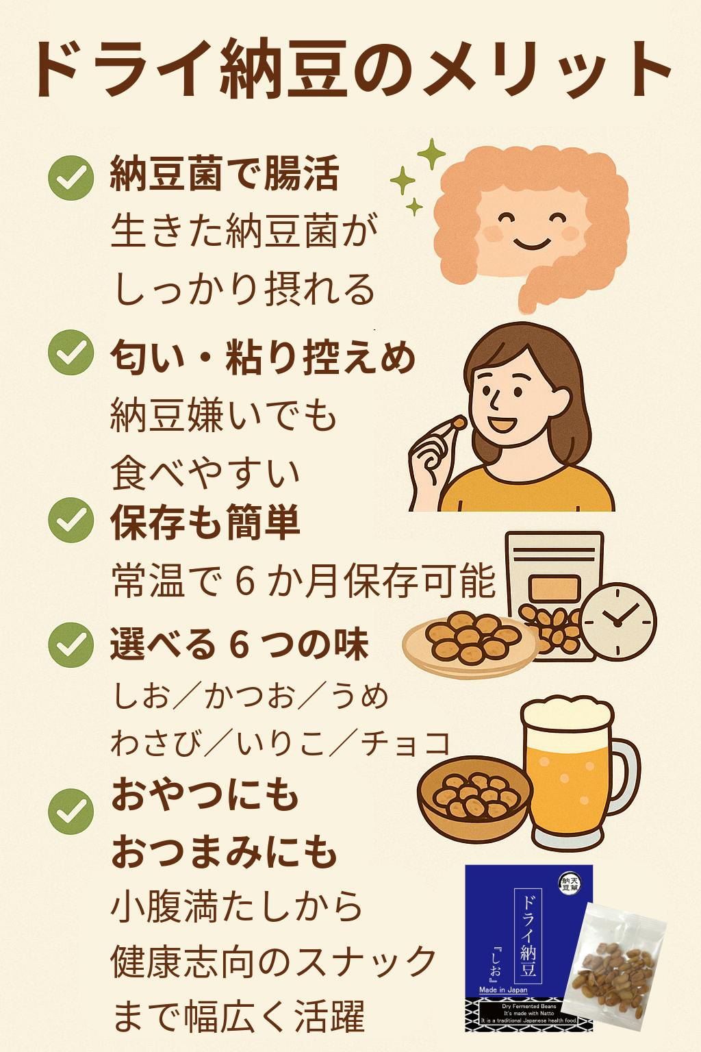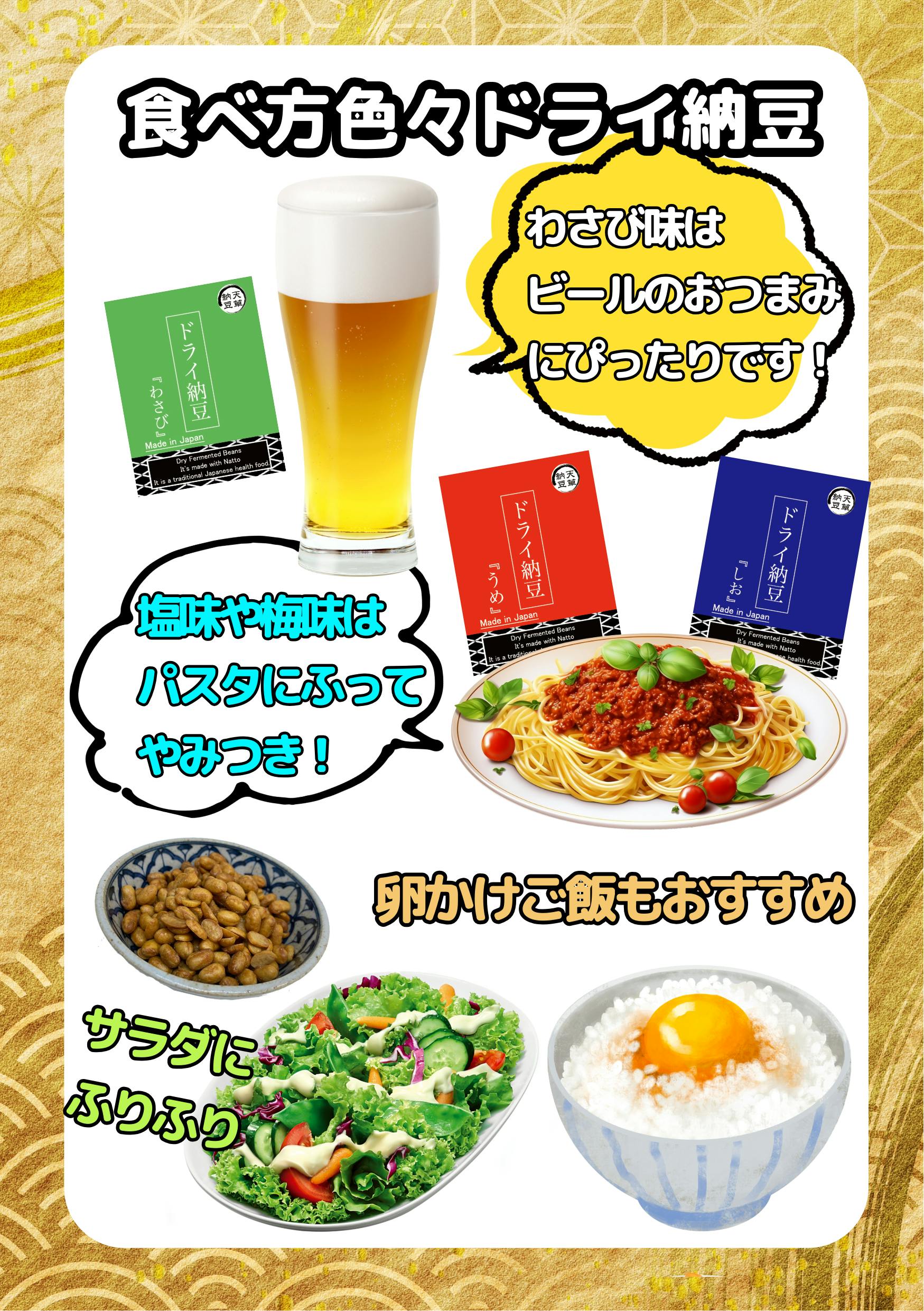 一口にドライ納豆といっても、実は種類があります。従来は、塩を加えて干した「干し納豆」や、凍結乾燥させた「フリーズドライ納豆」が主流でしたが、どちらも匂いや粘りが気になるという声が多くありました。